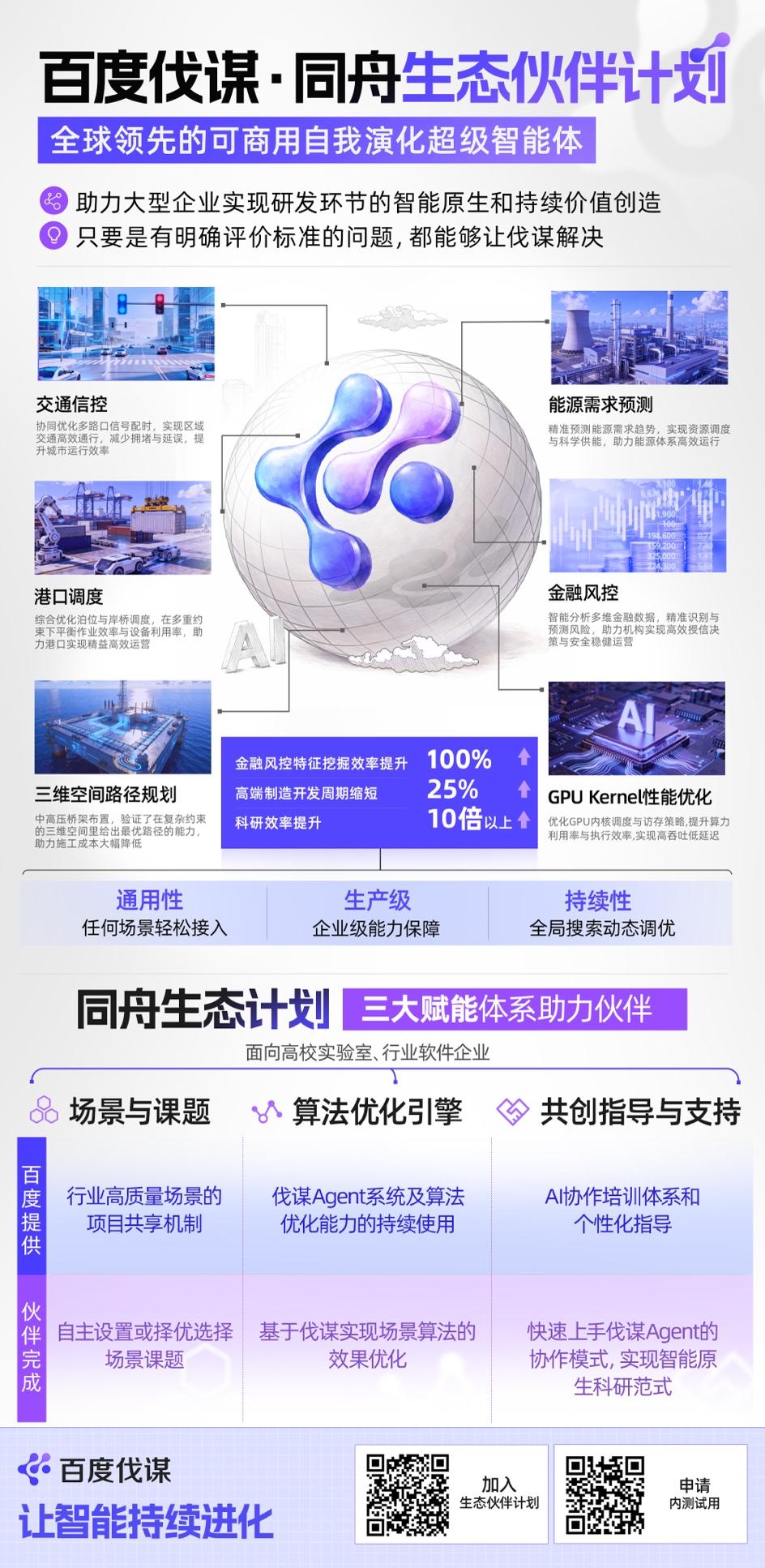 启动“同舟生态伙伴计划”,寻找千行百业“全局最优解”为了进一步加速AI在千行百业的渗透,让顶尖算法工程师将成为企业和科研标配,百度伐谋正式发布“同舟生态伙伴计划”,面向高校实验室、行业软件企业,开放高质量行业场景与课题,共享伐谋Agent系统及算法优化引擎,并提供AI协作培训与个性化服务指导。对于高质量伙伴的科研创新或产业实践项目,百度伐谋将提供全面免费支持。