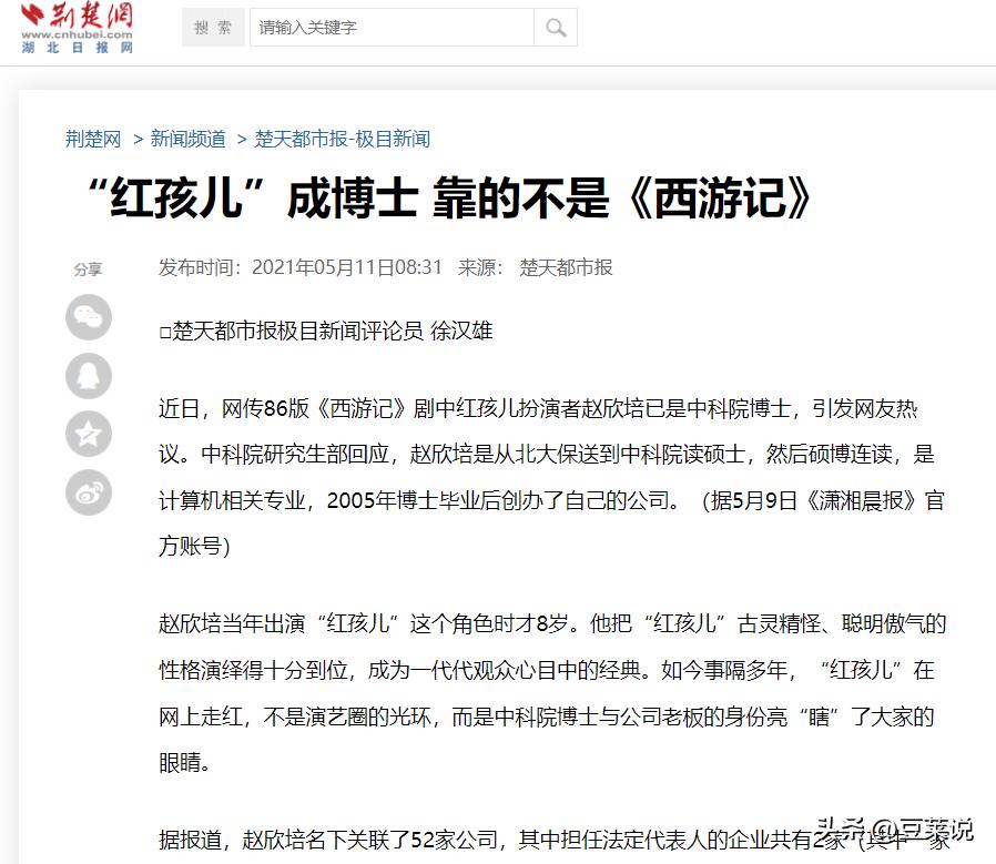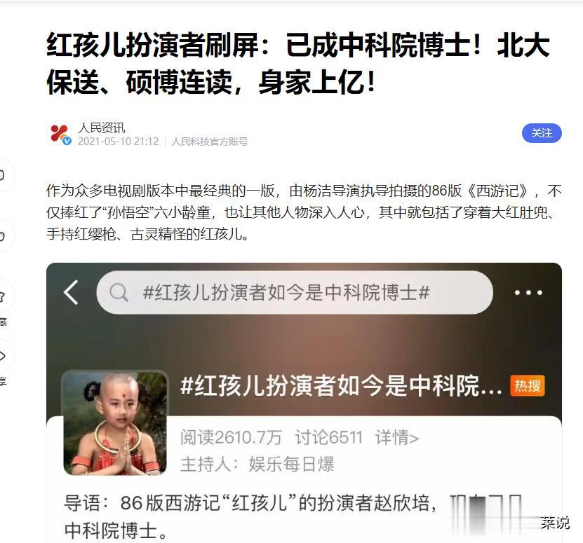 信息来源:红孩儿扮演者刷屏:已成中科院博士!北大保送、硕博连读,身家上亿!