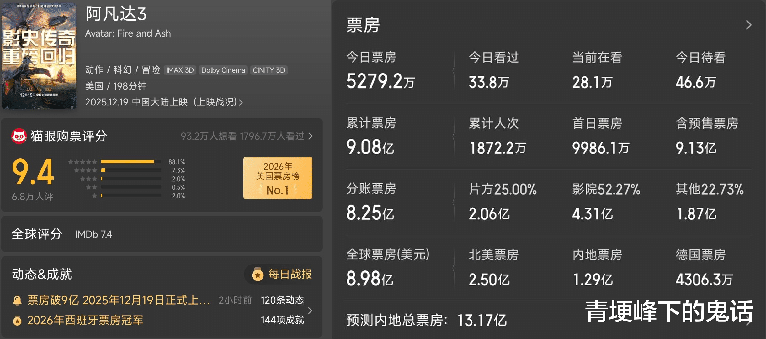 截至12月29日,《阿凡达3》全球票房已达8.98亿美元,其中中国市场突破9亿元人民币(约1.26亿美元)。这组数字虽不及前作辉煌,却足以证明影片在全球范围内仍拥有坚实的观众基础。