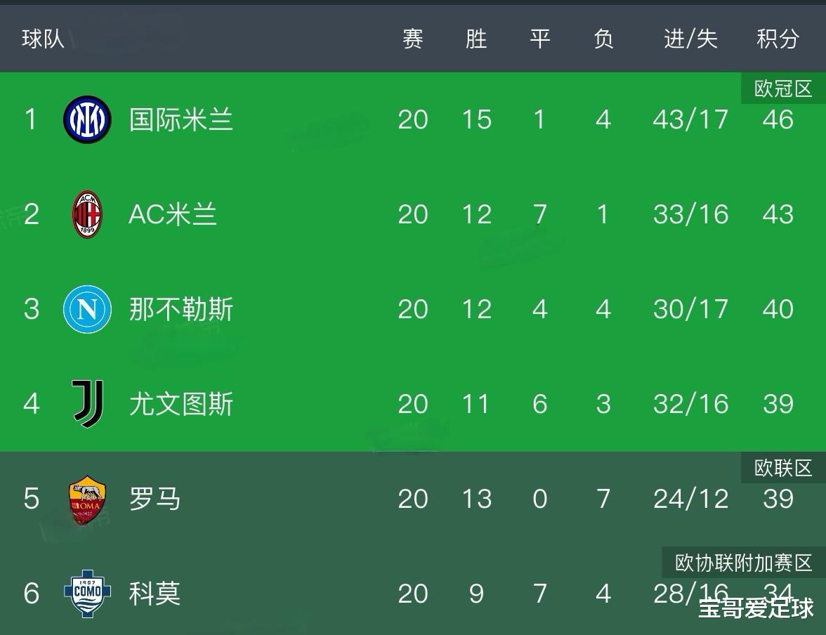 随着AC米兰在意甲第16轮的补赛中客场3-1战胜科莫,所有意甲球队本赛季的联赛场次都达到了20场,这也让积分榜的排名变的更加直观起来,国米以46分排名意甲榜首,在新帅齐沃的带领下,大有重夺意甲冠军的势头,而在他们的身后,还有4支球队对榜首位置虎视眈眈。AC米兰以43分排名意甲第2,单线作战是他们最大的优势;那不勒斯以40分排名意甲第3,伤病成为他们最大的敌人;尤文图斯39分排名第4,在斯帕莱蒂的执教下,尤文强势复苏,加入了意甲冠军争夺战;罗马39分排名第5。若无巨大意外,本赛季意甲冠军肯定会在这5支球队之中产生,由于彼此间积分相差不大,争冠的同时也是在争四,即争夺下赛季欧冠资格。