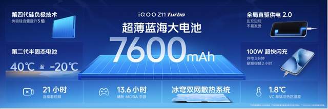 iQOO Z11 Turbo内置7600mAh超薄蓝海大电池,采用行业领先的第四代硅负极技术,能量密度达iQOO全系最高的860Wh/L,续航能力远超同尺寸性能机。配合100W超快闪充与全局直驱供电2.0技术,边玩边充不发烫、不伤电池,一杯咖啡的时间即可回血过半。