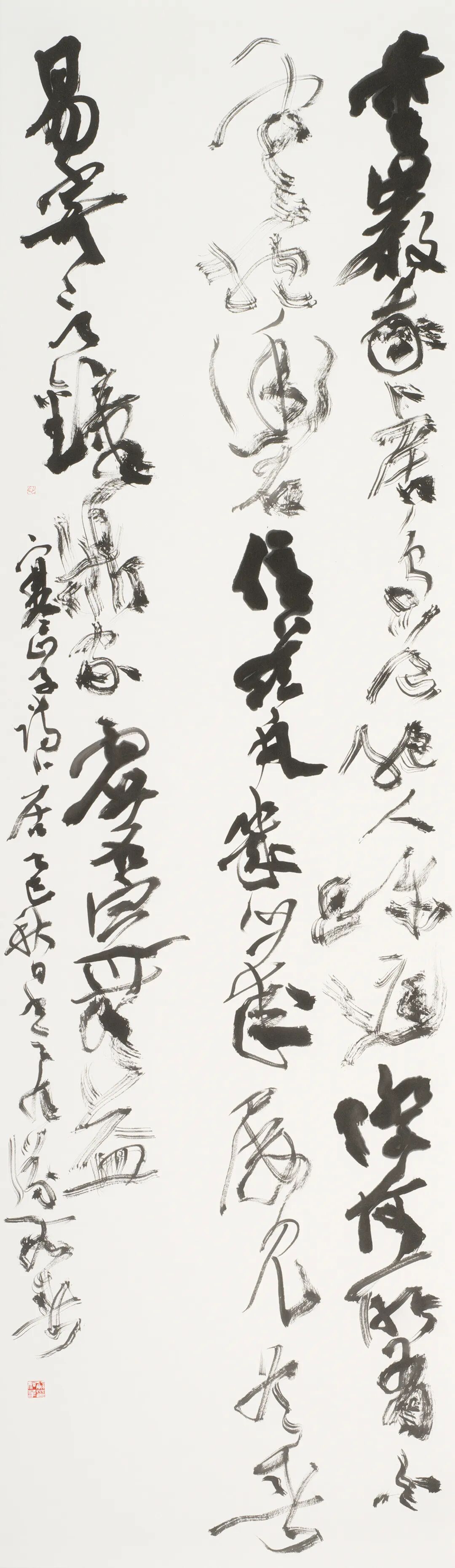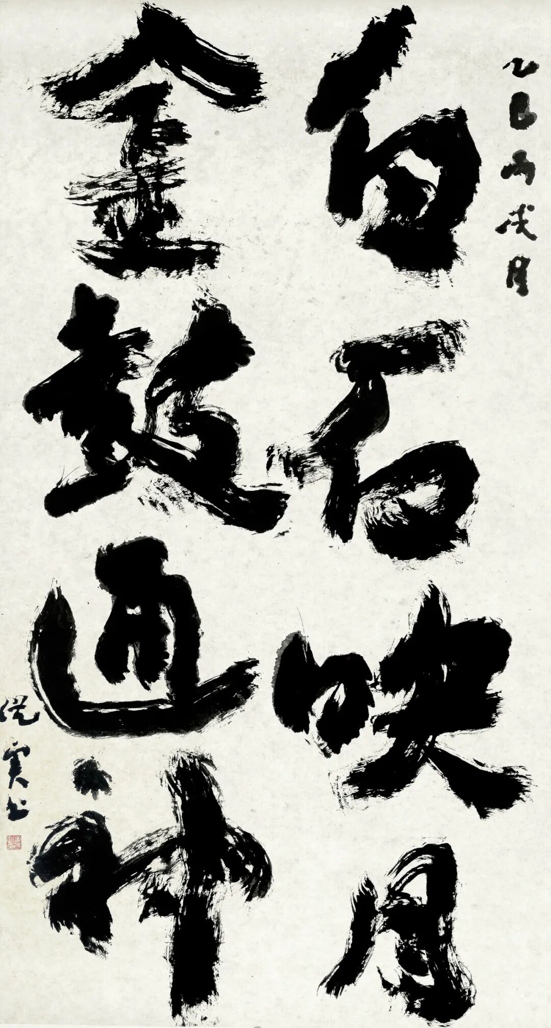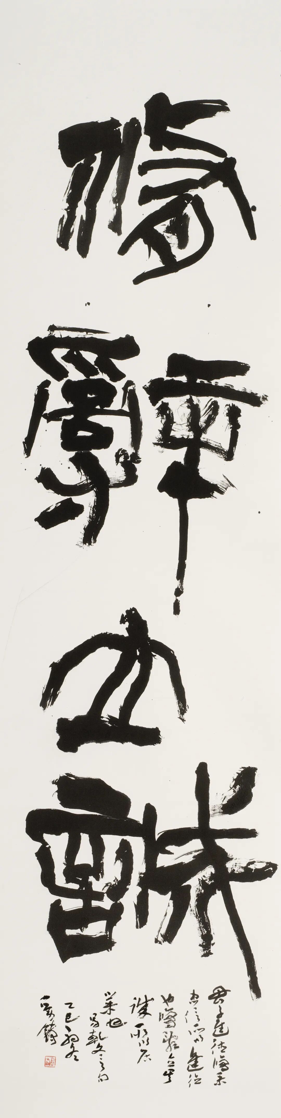 笔墨语言上,我不局限于篆书的藏锋、中锋等基础技法,多采用裹锋和绞转笔法,力求线质古劲遒厚、表现出苍茫感,时用托笔、翻笔、侧锋,率意而不失规矩;书写时感性释放,参行草之意、融摩崖元素,追求雄强朴茂之气象。