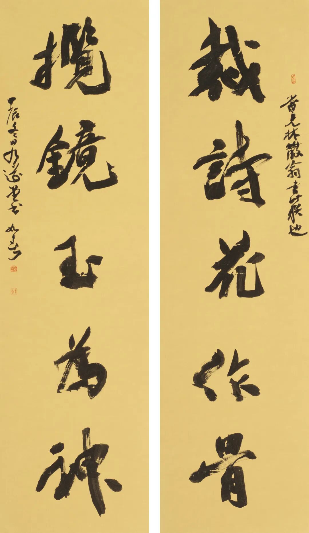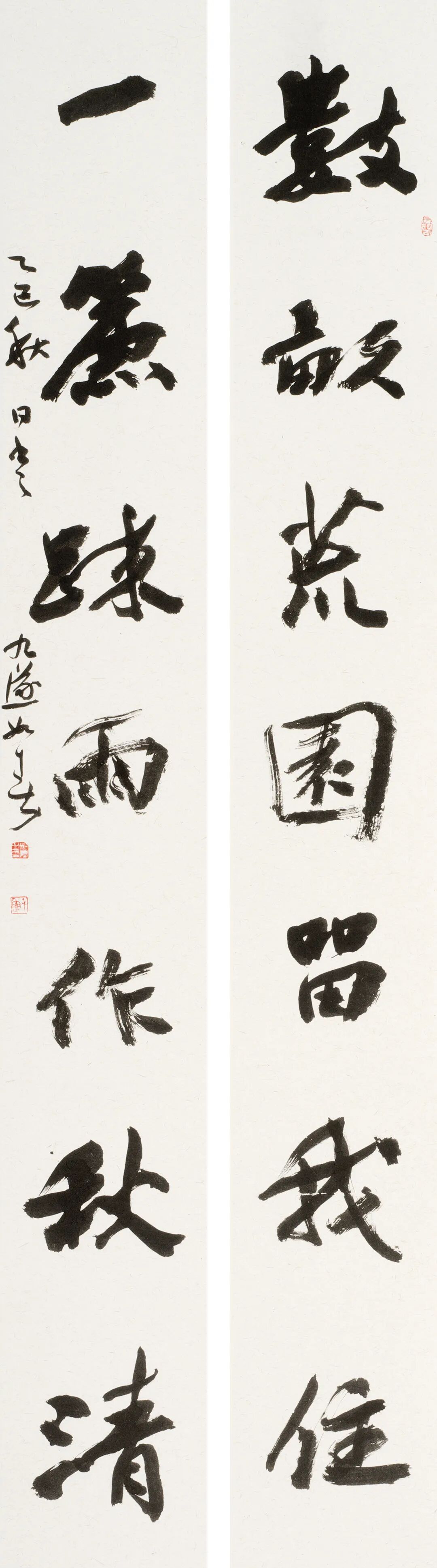 准备本次展览的作品,所用尺幅较大,于我而言是挑战,但基本是在自然轻松的状态下完成,收获也较多。一是注重文本内容与文字风格相契合;二是章法选用,随形就势;三是作品取法基调明显,把握其主要特征;四是强化结字造型能力,选字用字尽可能正确、丰富、协调;五是以墨色变化、块面营造强调整体节奏感,努力使作品气息雅正,体现时代共性。