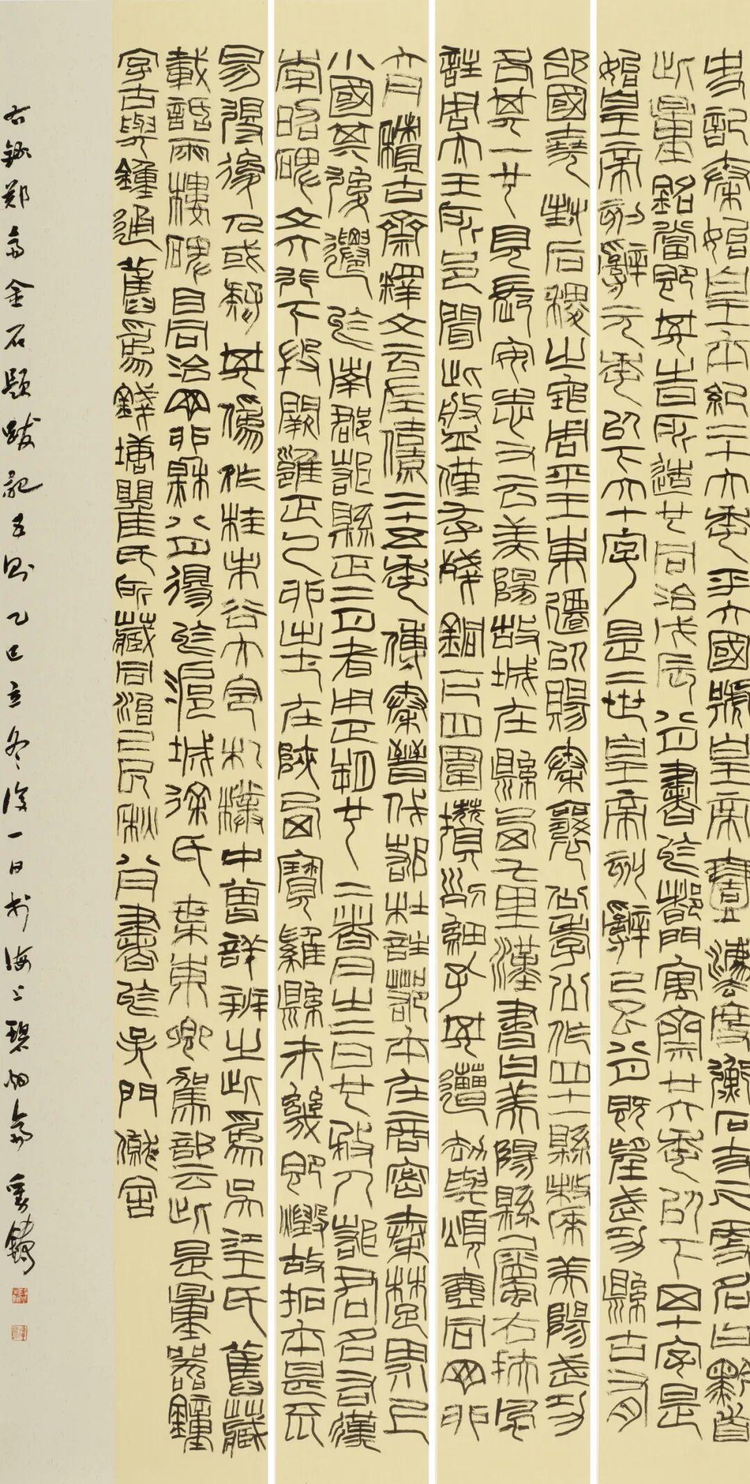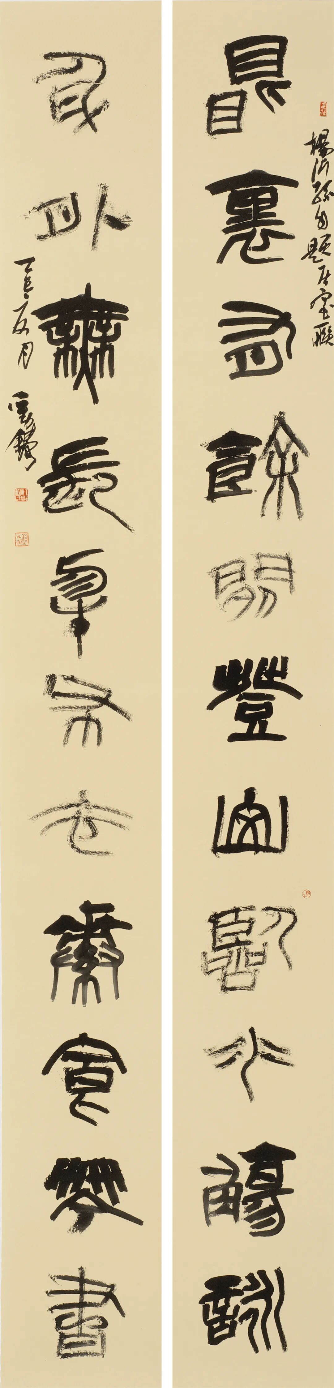刘铸兄和我一样,专业背景是汉语言文学。他古典文学和传统文化的学养丰厚,比我早一年师事李昌集先生,很早便表现出对金石书法的敏感聪慧,有突出的天分。近年来,刘铸兄对战国秦汉的古文字作了系统深入的研究学习,其篆书作品在省级以上展览中屡屡入展、得奖,成绩骄人。他的作品注重书体风格与书写内容的高度契合,讲究文字本身的历史系统,不纷乱,不驳杂,用字具有鲜明的学术性;更可贵的是,笔法结字在合乎规范的基础上轻松自由,表现力丰富,常常能进入随心所欲的自在状态。我认为,刘铸兄的篆书已经具备了相当的艺术价值,能给人以启发。
