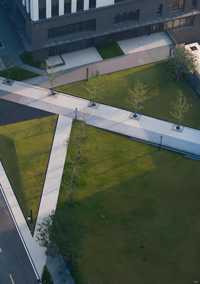 实景中的空间规划,藏着对“边界”的细腻考量:楼栋外围种植的绿植,形成天然的“隔音带”,有效削弱外界噪音干扰,为办公区筑牢专注基础。