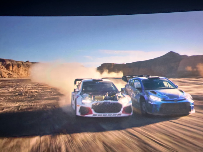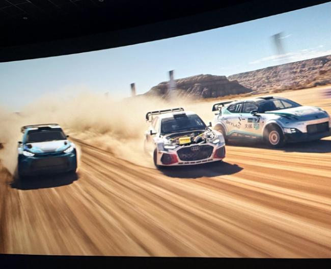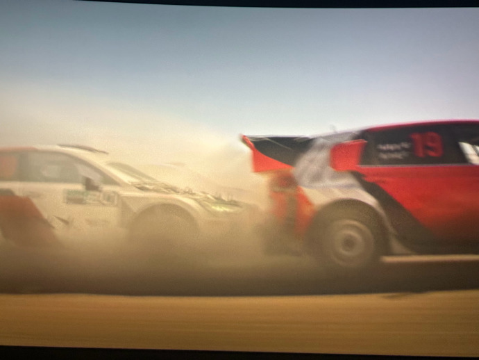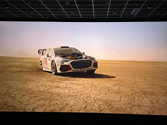 这一部你还能明显感受到思路上借鉴了去年《F1》的拍法:它不只追求“看起来很快”,而是更强调车内的主观视角,以及赛车与赛道环境之间的空间关系。比如车舱内持续的颠簸与震动、两侧景物的流动与擦碰,再到中景里轮对轮的缠斗与相对位置的变化。这些细节一点点堆出来的速度感,更接近比赛现场那种“真实的推进”,而不是靠高速镜头强行推背,把速度拍成一种夸张的效果。