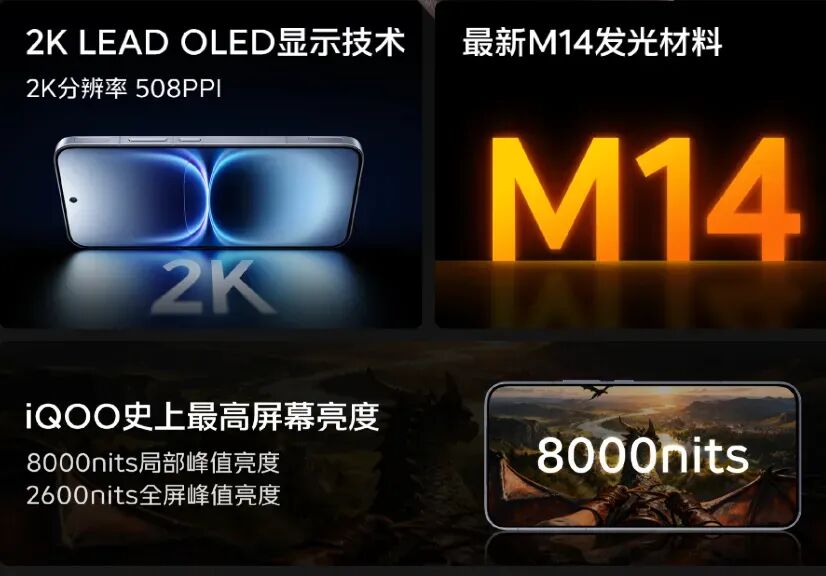 结合官方海报来看,iQOO15 Ultra屏幕采用 2K LEAD OLED 显示技术,支持 2K 分辨率、508PPI;最新 M14 发光材料,iQOO 史上最高屏幕亮度,支持 8000nits 局部峰值亮度、2600nits 全屏峰值亮度。