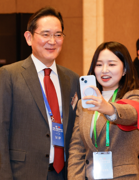 工作时李在镕可不是这样子,仪表仪容整齐干练,戴着一副眼镜斯文又儒雅,还有一个小姐姐与他合影,看来三星老板名气不小,而且还很有影响力。