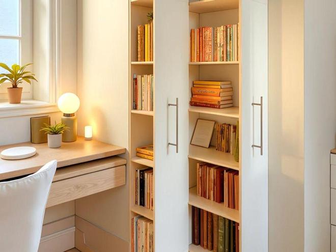 看看年轻人的做法,就是在书桌和侧面墙之间的缝隙处,安装极窄的文件柜。虽然文件柜很小,可以用来存放常用的文件、笔记本、文具等等。
