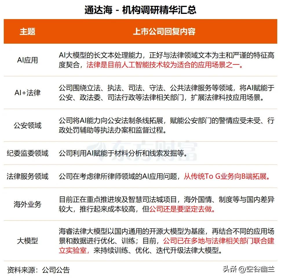 公司将法律领域定为AI技术核心应用场景,积极推进“AI+法律”战略,打造的海睿法律大模型,以开源大模型为基座,结合立法、执法、司法等不同场景数据优化训练,还在多地与法律相关部门共建实验室,持续迭代升级模型,夯实技术核心竞争力。目前,AI赋能已落地公安法制、纪委监委等多个领域,助力警情处理、材料分析、线索发掘等工作,实战价值凸显。