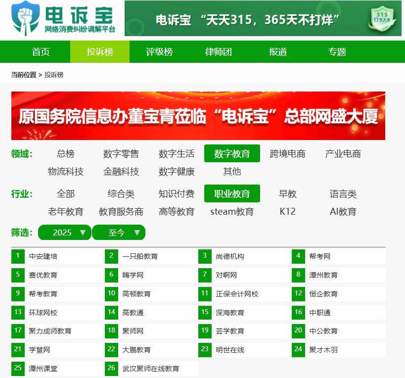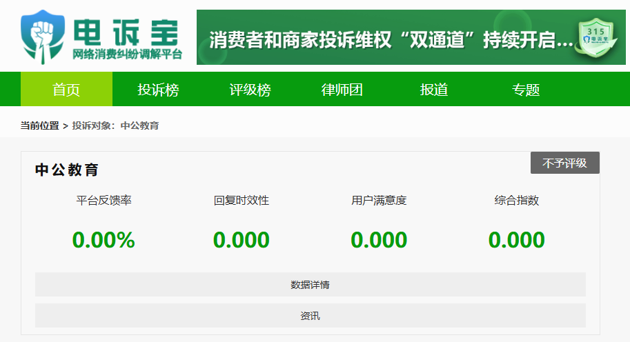2025年至今,“电诉宝”受理投诉中涉及的数字教育领域中职业教育用户有效投诉显示(依据投诉量排行),“中公教育”排名第20位。最新评级为“不予评级”。除此之外,其他被投诉的类似平台还有:中安建培、一只船教育、尚德机构、帮考网、赛优教育、嗨学网、对啊网、潭州教育、帮考教育、高顿教育、正保会计网校、恒企教育、环球网校、高教通、深海教育、中职通、聚力成师教育、聚师网、芸学教育、学慧网、大鹏教育、中安建培教育、明世在线、聚才木羽、潭州课堂、武汉聚师在线教育。
