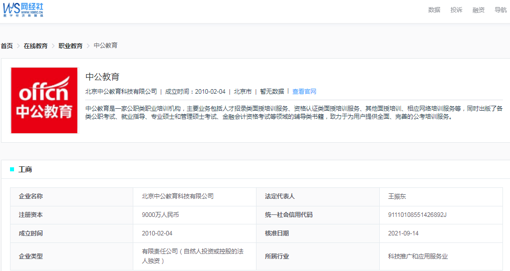 网经社企业库显示,中公教育隶属于北京中公教育科技有限公司,该公司成立于2010年2月4日,法定代表人王振东。