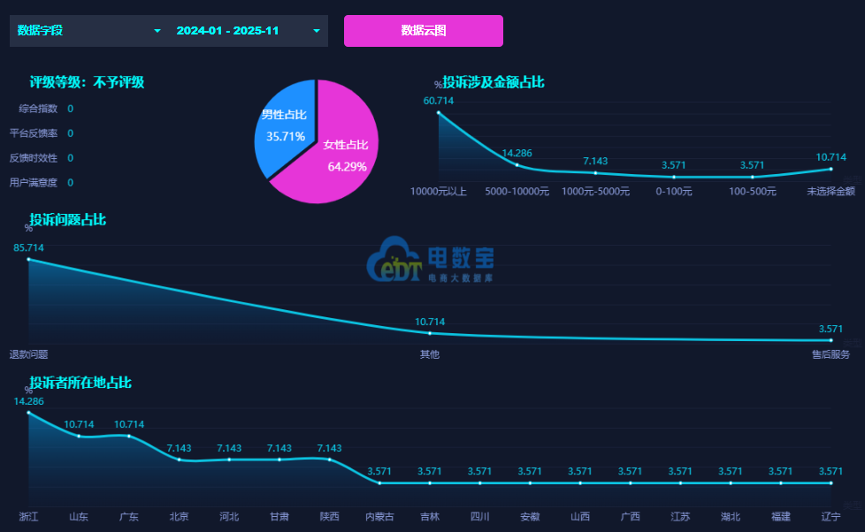 据网经社旗下电商大数据库“电数宝”监测数据显示,中公教育2024年至今投诉的问题主要包括退款问题、其他、售后服务,其中退款问题占比最高,达到了约85.7%。