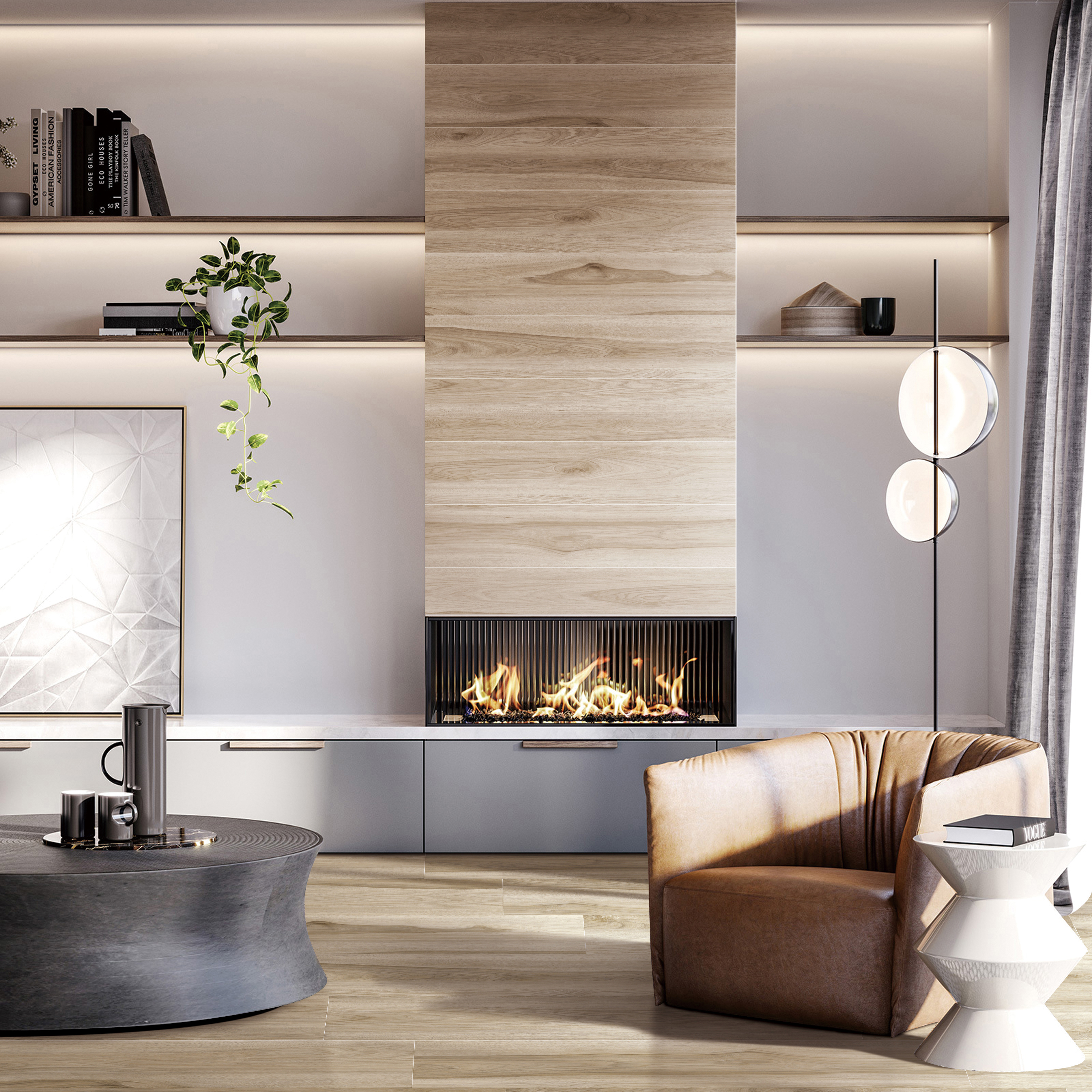像图里这样,把组国际瓷砖品牌伊莉莎白蓝山橡木瓷砖用在壁炉 / 背景墙的纵向区域:浅暖原木纹理自带柔和滤镜,纵向通铺能拉伸空间比例,搭配无主灯的线性光,既弱化了墙面的 “厚重感”,又让自然肌理成为视觉焦点 —— 哪怕客厅面积不大,也能装出通透的 “大宅感”。