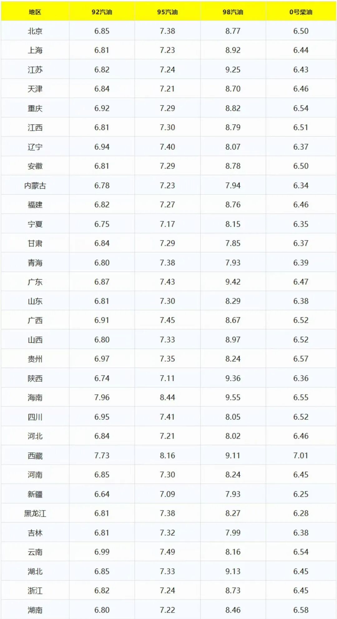 12月20日全国各省市汽油价格表