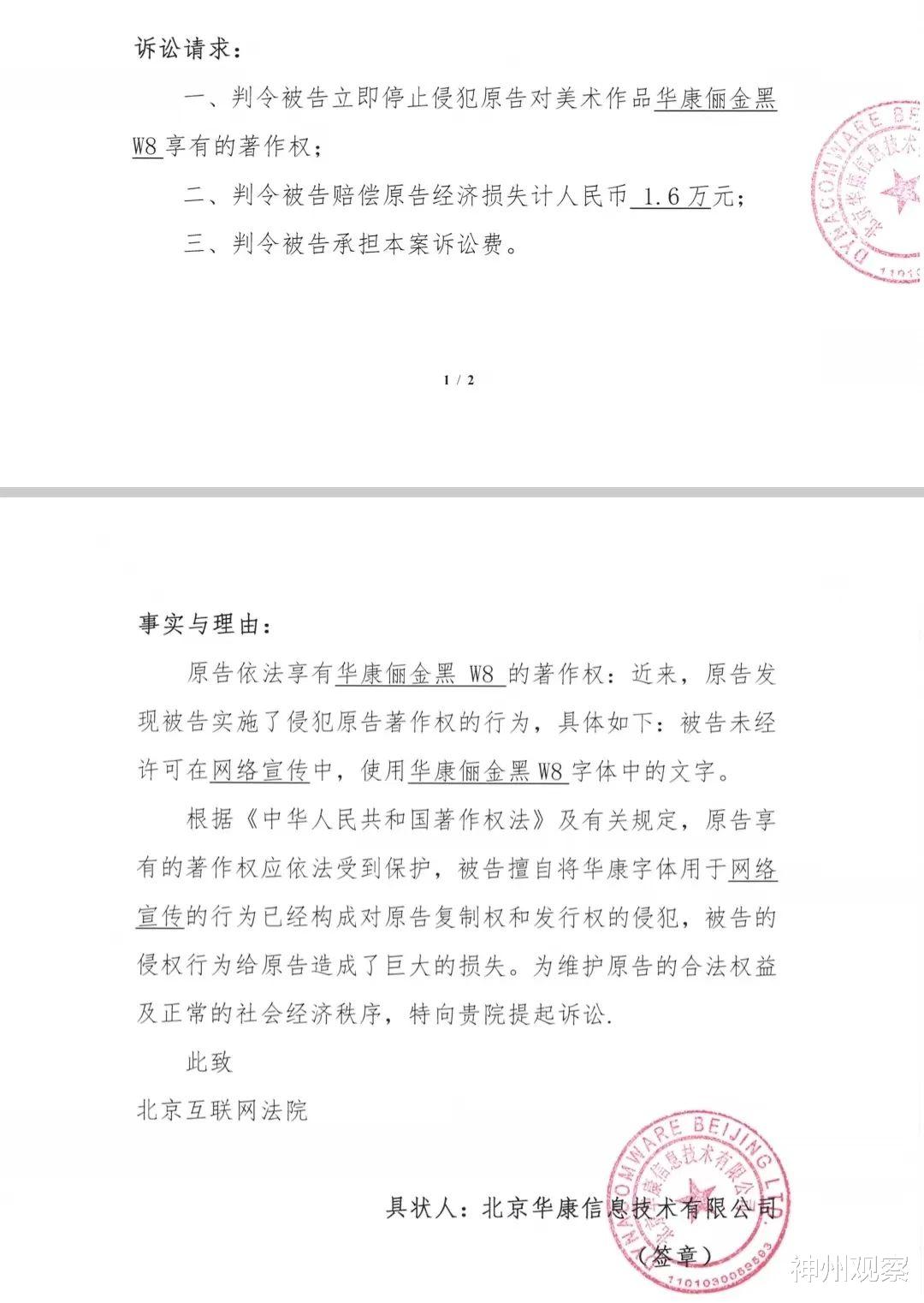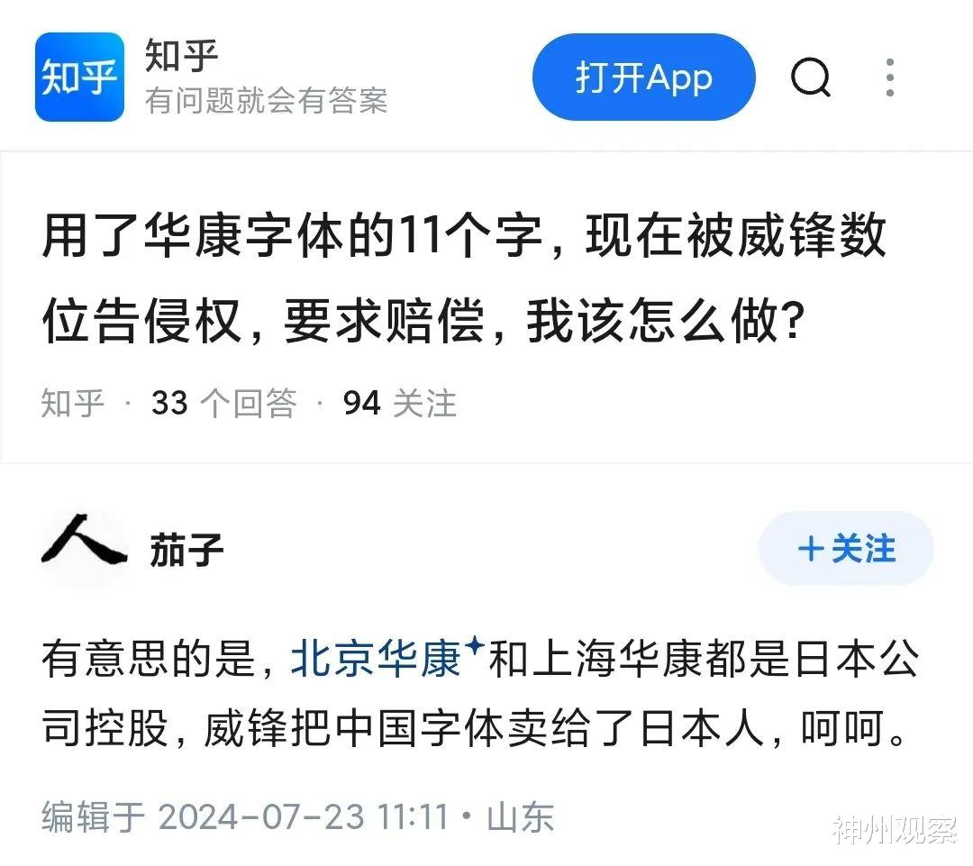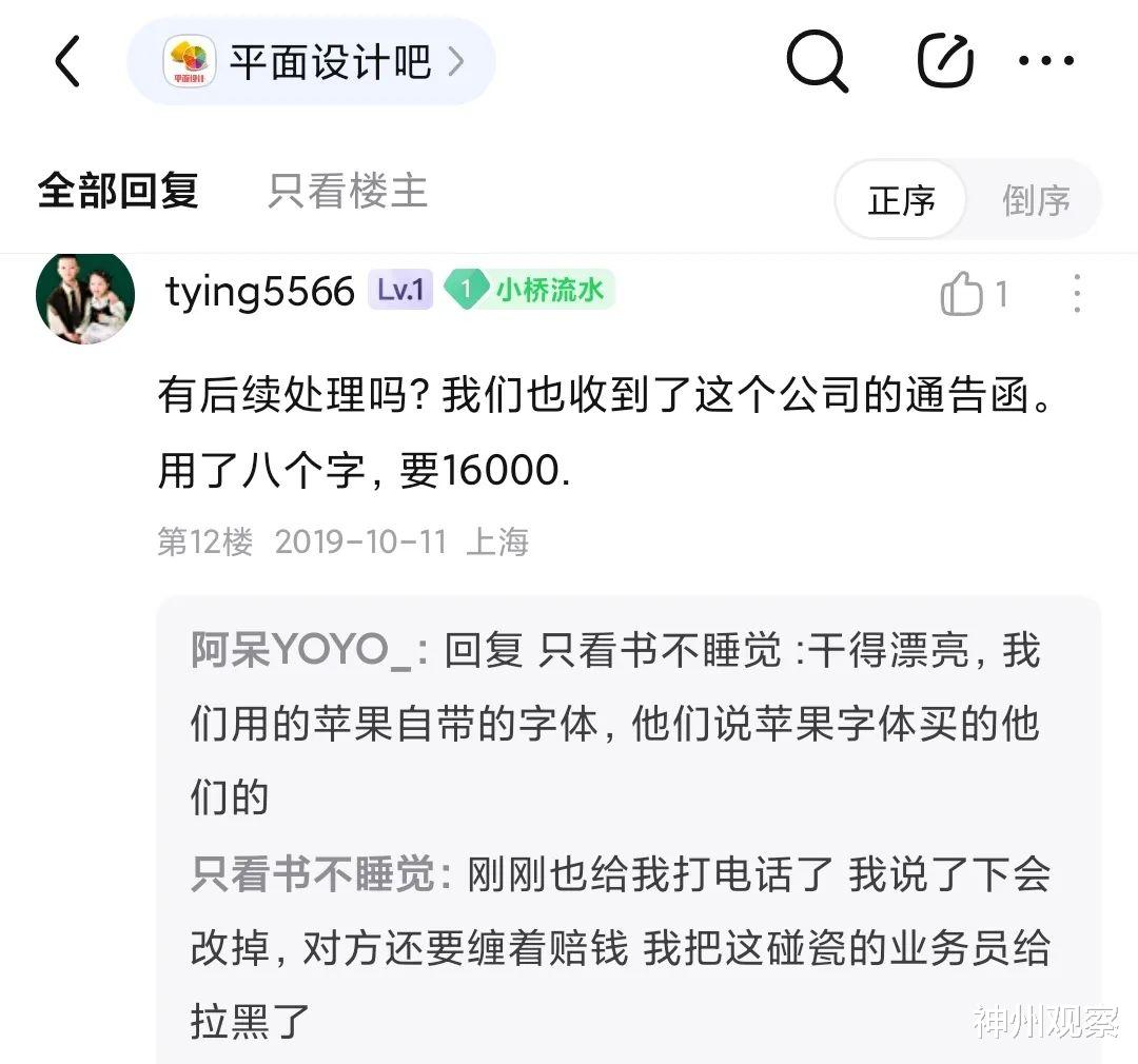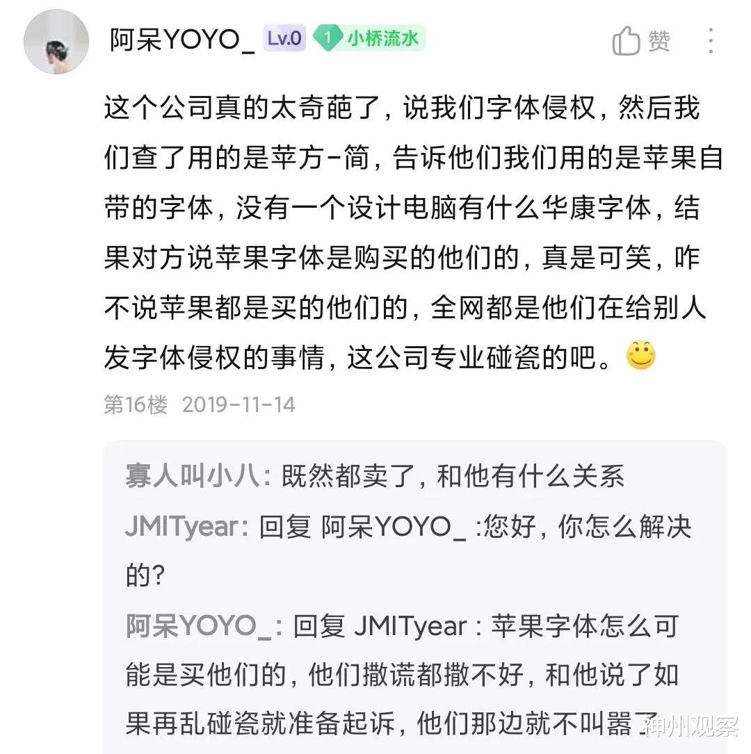 公开资料显示,“华康俪金黑”字体原属位于台北的“威锋数位开发股份公司”所有,后来转让给了华康公司。知乎网友也佐证了这一点,并披露了他们被索赔的经历——