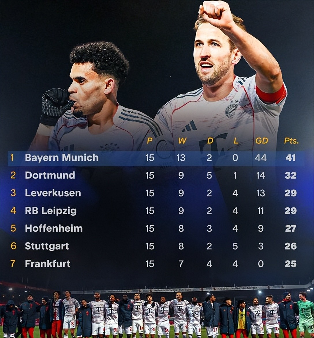 而在25/26赛季的前15场比赛中交出了13胜2平的不败战绩的拜仁,会在本赛季达成队史的首次赛季不败夺冠的成就吗?