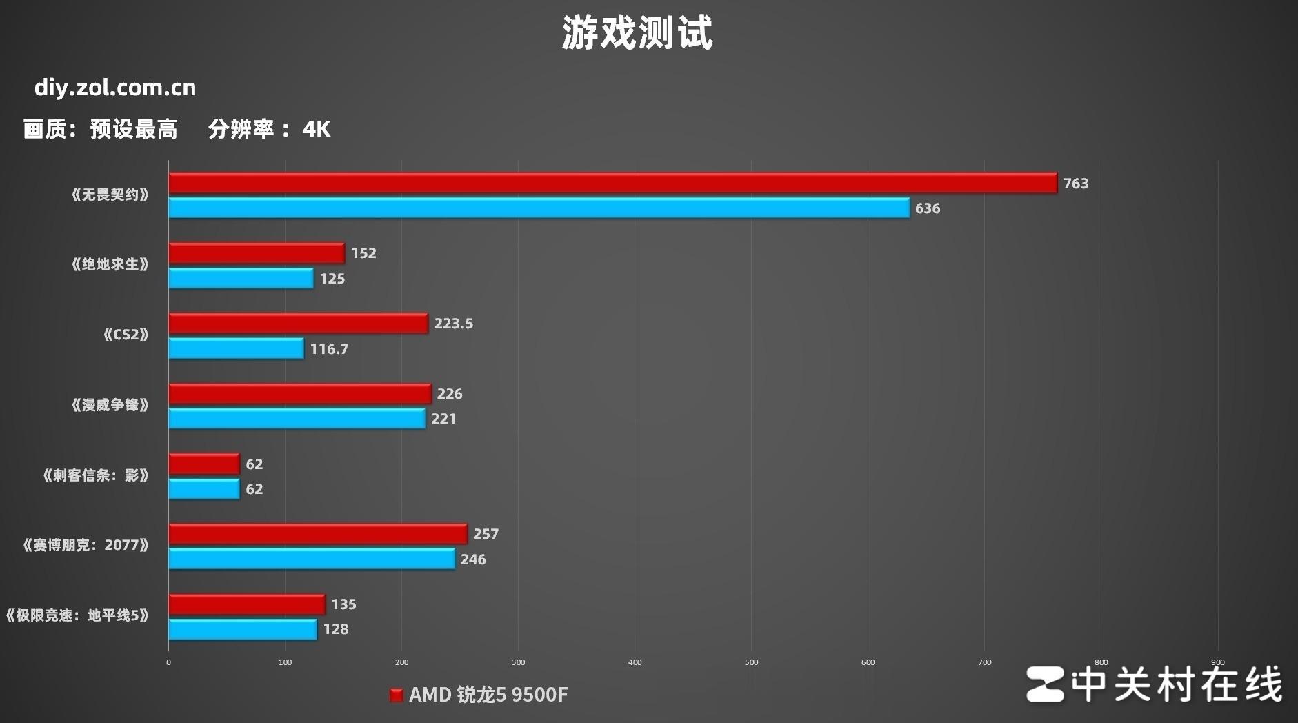4K分辨率对于处理器的需求会比1080p和2K小很多,主要依靠显卡的性能。不过随着显卡性能越来越强,高分辨率显示器也越来越普及,玩4K的游戏玩家也越来越多。而处理器只是影响小而不是没有影响,所以我们看到AMD锐龙5 9500F平台在4K分辨率下,除了《刺客信条:影》帧数打平外,其余6款帧数也均超过了英特尔酷睿i5-14600KF平台。所以综合这三个分辨率的帧数表现,在我们测试的这些游戏中,AMD锐龙5 9500F平台可以说游戏基本完胜了搭配DDR4内存的英特尔酷睿i5-14600KF平台。