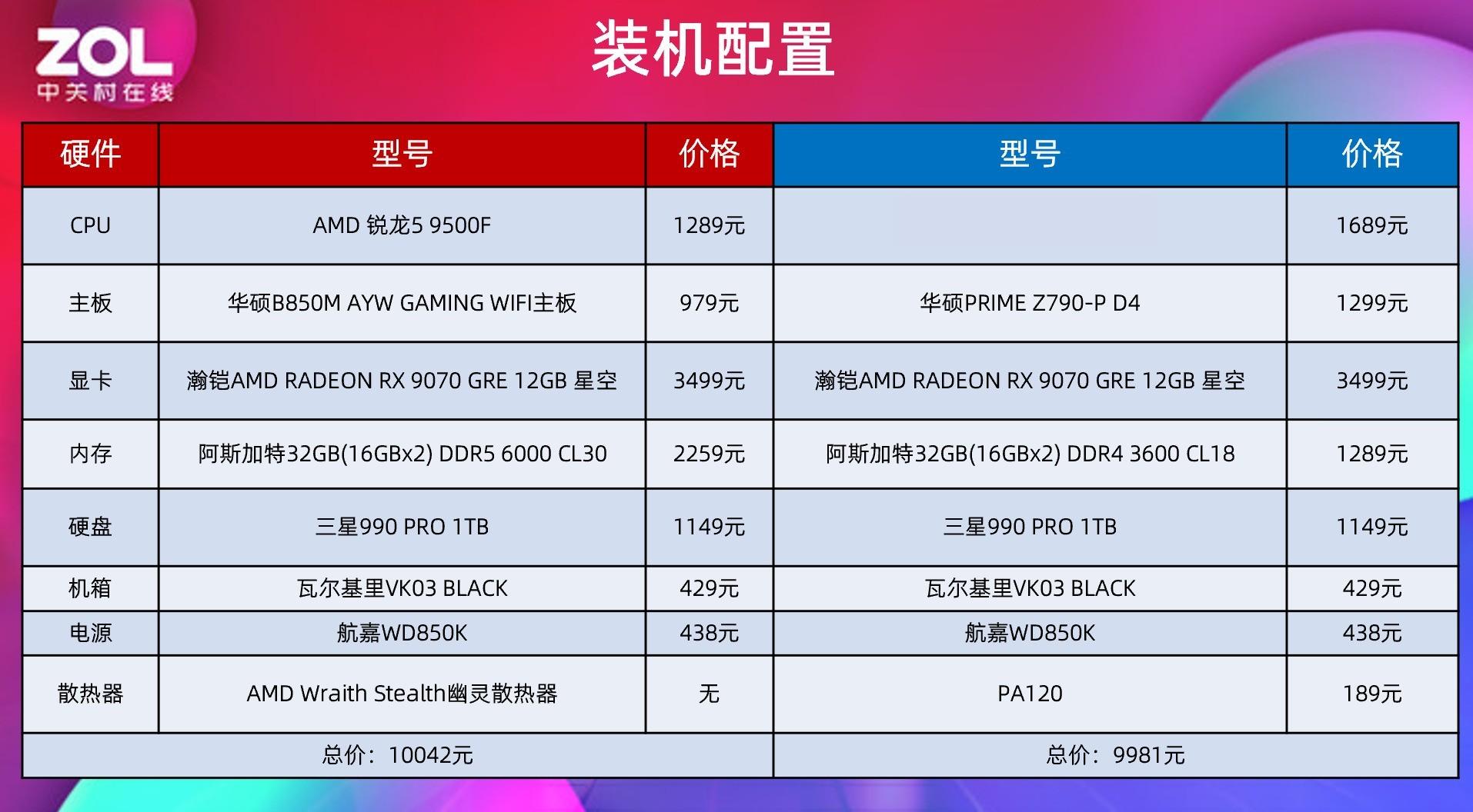 目前来看,DDR4内存基本走到头了,DDR5平台还只是开始上限更高,未来只会越来越普及,性能也会越来越强,不管是AMD还是英特尔下一代平台对于DDR5的支持也会越来越深。当然DDR4依旧是一种可以考虑的装机方式,不过这种装机方式更适合那些本身家里有DDR4老旧平台的用户来升级使用,这能帮助节省一笔内存开支。而不管是从长远角度还是从性能本身,又或者从产品性价比来说,AMD锐龙5 9500F搭配DDR5都是更具优势的选择,本身AMD平台的兼容性就强,购买后能够支持到2027年,现在游戏性能还要比竞品更高,而且其实综合装机价格也不会比搭配DDR4的英特尔酷睿i5-14600KF平台高很多,下面给大家配置单对比一下。