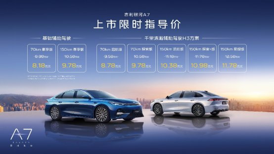 吉利银河A7共推出七个版型,分别是150km星舰版、150km探索+版、150km远航版、150km尊享版、70km探索版、70km启航版、70km豪享版,上市限时指导价为8.18万元—11.78万元。即日起,用户可通过吉利银河APP、微信小程序、抖音小程序及官网等官方渠道下订。下订用户限时免费享价值8800元的16扬Flyme Sound无界之声、限时免费享价值2000-5000元配置升级、限时享8万24期0息等八重购车权益以及不限品牌的8000元超级置换金。