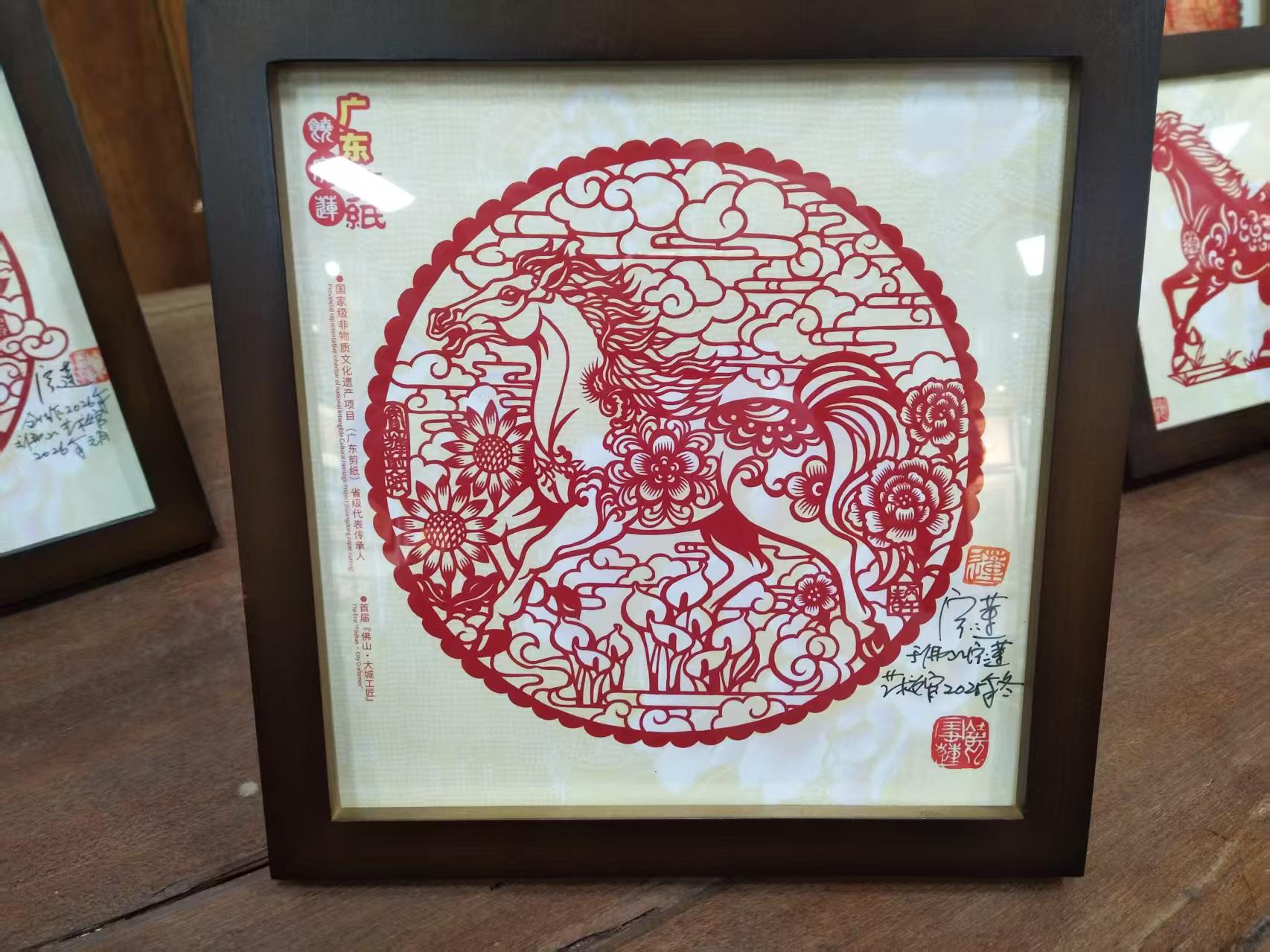 我很快赶到位于石湾人工湖旁的饶宝莲工作室,只见她一手拿着玉米,一手拿着手机通话,嘴里一边啃着玉米,一边呼唤着助手拿这个东西、拿那个东西。她说,今年的生肖剪纸,3个基础图案已经出来了,每个图案分别可以用5种手法,包括:纯色、金铜凿、铜衬、铜写、金箔去制作,总共做出15款剪纸。有些款色刚刚量产,比如《千里马》纯色剪纸,刚刚量产50件,但就被抢购一空,现在被多个客户催货,不得不加班赶工。