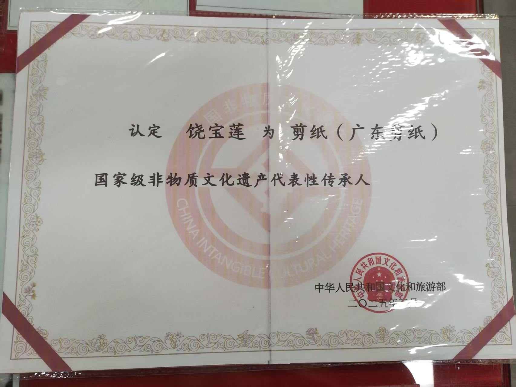 饶宝莲国家级传承人证书
