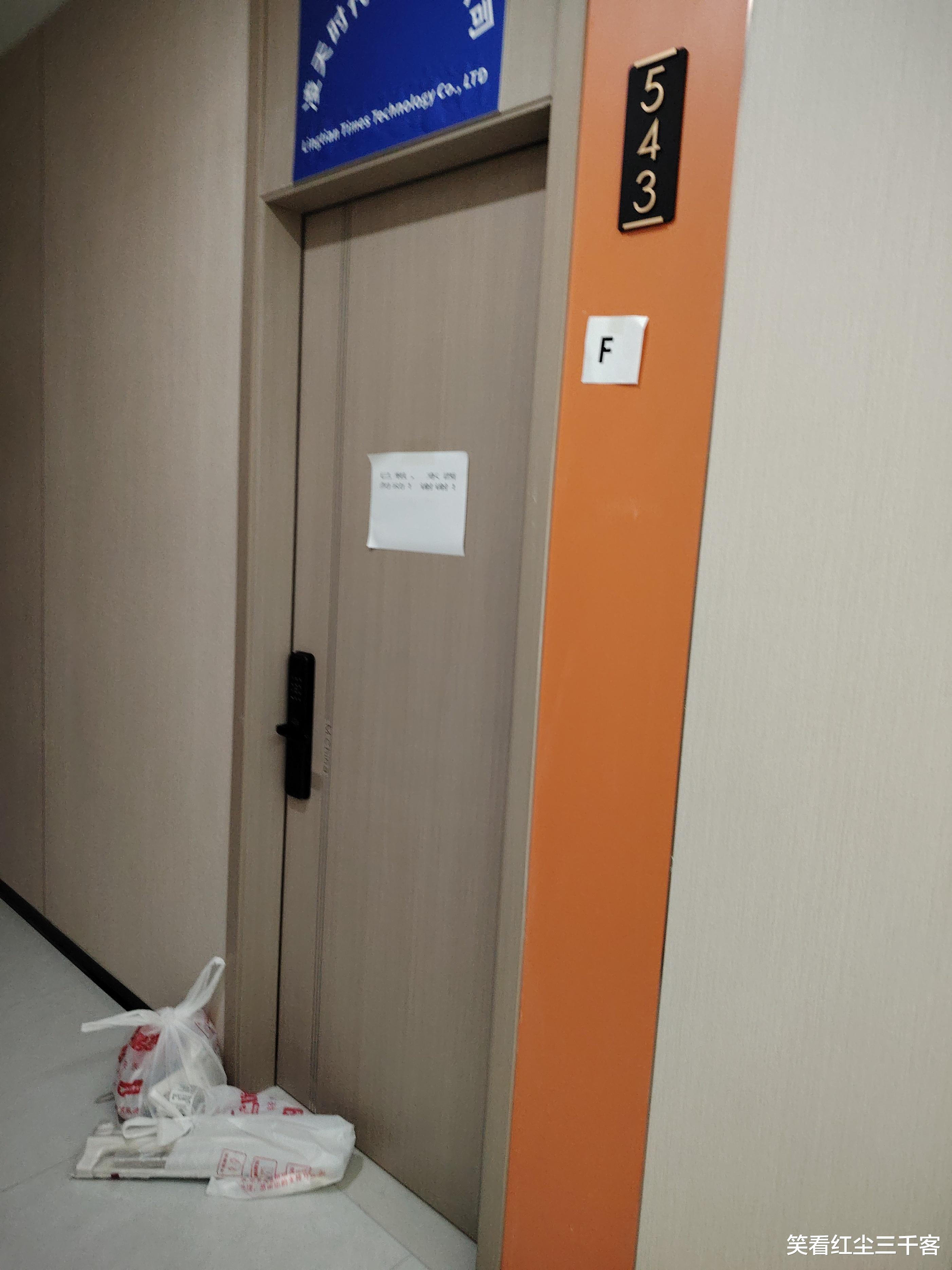 当你们看到上面这张照片时,凭直觉感受它属于哪种场所?反正我身临其境的时候,第一感觉这里是公寓,不管是从走廊还是从门子的风格来看,都是住宿场所。可是当我拿着外卖找到对应的房间号时,看到门头上某某公司的牌照,一下子惊住了,这里居然不是住宅,是公司?