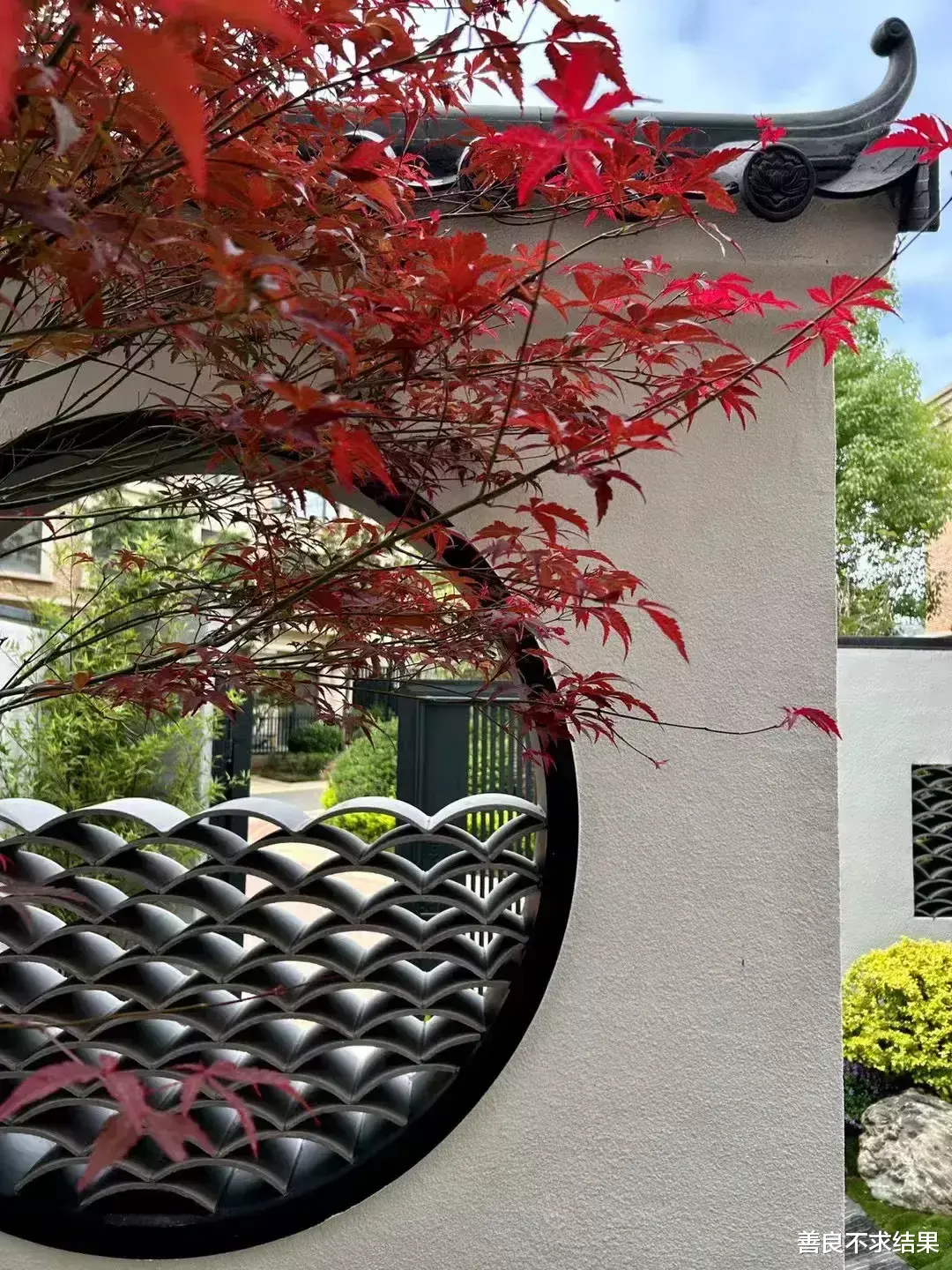 青砖+灰瓦+白墙,更能将红枫的婀娜多姿,艳丽多彩体现的淋漓尽致。