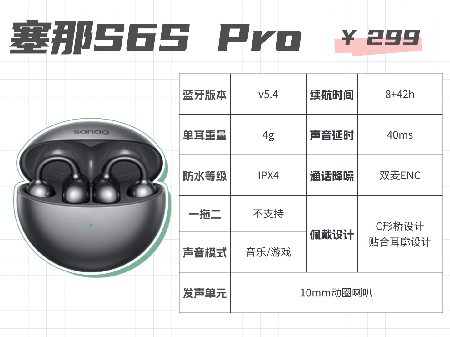 塞那 S6S Pro:这款耳机在设计上亮点突出,C 形桥设计搭配贴合耳廓的造型,让整体与耳朵贴合度更高,再结合单耳 4g 的轻盈重量,带来了非常舒适的佩戴体验。