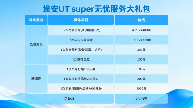 事实上,埃安UT super前期做了详细的用户调研,以了解用户对“国民好车”最真实的需求。埃安UT super已经实现了多项同级领先的功能配置,如500公里续航、华为云车机、倒车哨兵等,并提供了超高性价比。同时,埃安UT super还做到了“核心产品价值体验领先,购买价格和使用成本领先”。租电模式购车价4.99万元、电池月租399元,在业内是鲜有。此外,对于三方前期服务衔接不足对用户造成的不便,广汽埃安宣布对在12月31日前下定购买埃安UT super的用户加码赠送价值2600元的“无忧服务包”。
