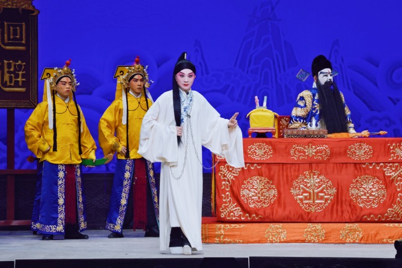 路洁为习得该剧精髓,自2020年起,每周专程赴天津向京剧名家王艳学习了三年。王艳老师对气口、劲头、身段等细节的严苛要求,让路洁精准把握了谢瑶环的人物特质。作为生旦两挑的剧目,路洁在剧中既需展现旦行的端庄柔美,又要诠释小生的轩昂英气。开场闷帘一声“来了”便能收获碰头彩,身着巡按红蟒官服的亮相英气勃发,完美诠释了正义化身的形象。“头公堂”一折中,堂审武宏的大段念白刚劲有力、张弛有度,将谢瑶环不畏权奸的凛然正气展现得淋漓尽致;“花园”一场则尽显女儿家的娇羞柔情,“谢瑶环深宫九年整” 的南梆子唱腔婉转旖旎,配合遮面团扇的细腻身段与小圆场走位,将与袁行健的情意绵绵刻画得美不胜收,与小生演员刘明哲的默契配合赢得满堂喝彩。
