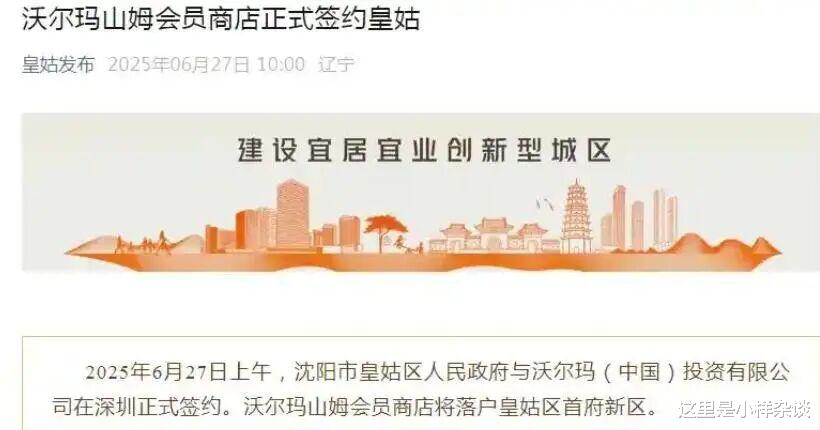 2025年6月27日,沈阳皇姑发布官方公众号发布消息《沃尔玛山姆会员商店正式签约皇姑》,当时沈阳市皇姑区与沃尔玛中国投资