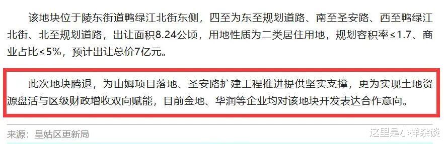 (图片来源于智汇皇姑官方公众号)这块地位于陵东街道鸭绿江北街东侧,南至圣安路、西至鸭绿江北街、北至规划道路,出让面积8.24公顷,用地性质为二类居住,规划容积率≤1.7,,商业占比≤5%,预计出让总价7亿元。最后文章提到此次地块腾退,为山姆项目落地、圣安路扩建工程推进提供坚实支撑,更为实现土地资源盘活与区级财政增收双向赋能,目前金地、华润等企业均对该地块开发表达合作意向。