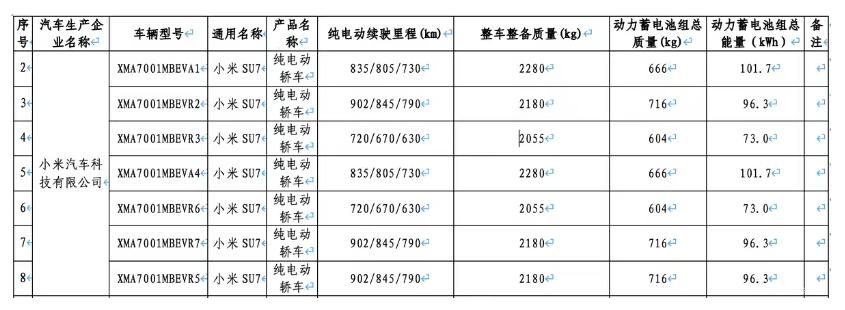 2 月 10 日消息,工信部发布的《减免车辆购置税的新能源汽车车型目录(第二十七批)》披露了新一代小米 SU7 的电池信息,新车申报了 73kWh、96.3kWh、101.7kWh 三种规格的电池包,对应 CLTC 工况下九种不同的续航版本,覆盖 630km 至 902km 区间。