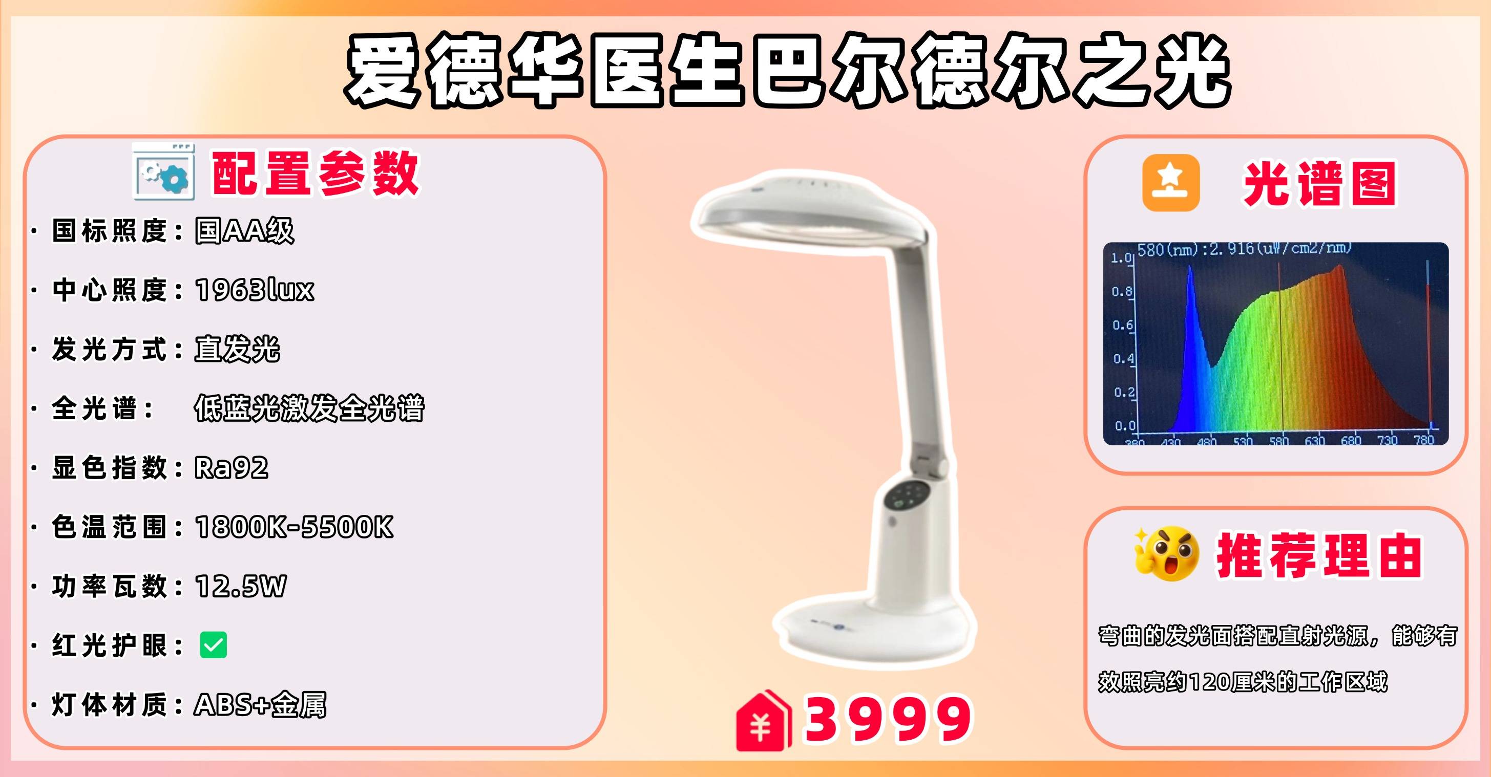 学生用的护眼台灯什么样的最好?爱德华医生巴尔德尔之光从光源面上就已经呈现了与传统台灯完全不同的设计,发光面上采用了略微弯曲的设计,配合上直发光的发光方式,光源所涉及的范围可以达到1.2m。