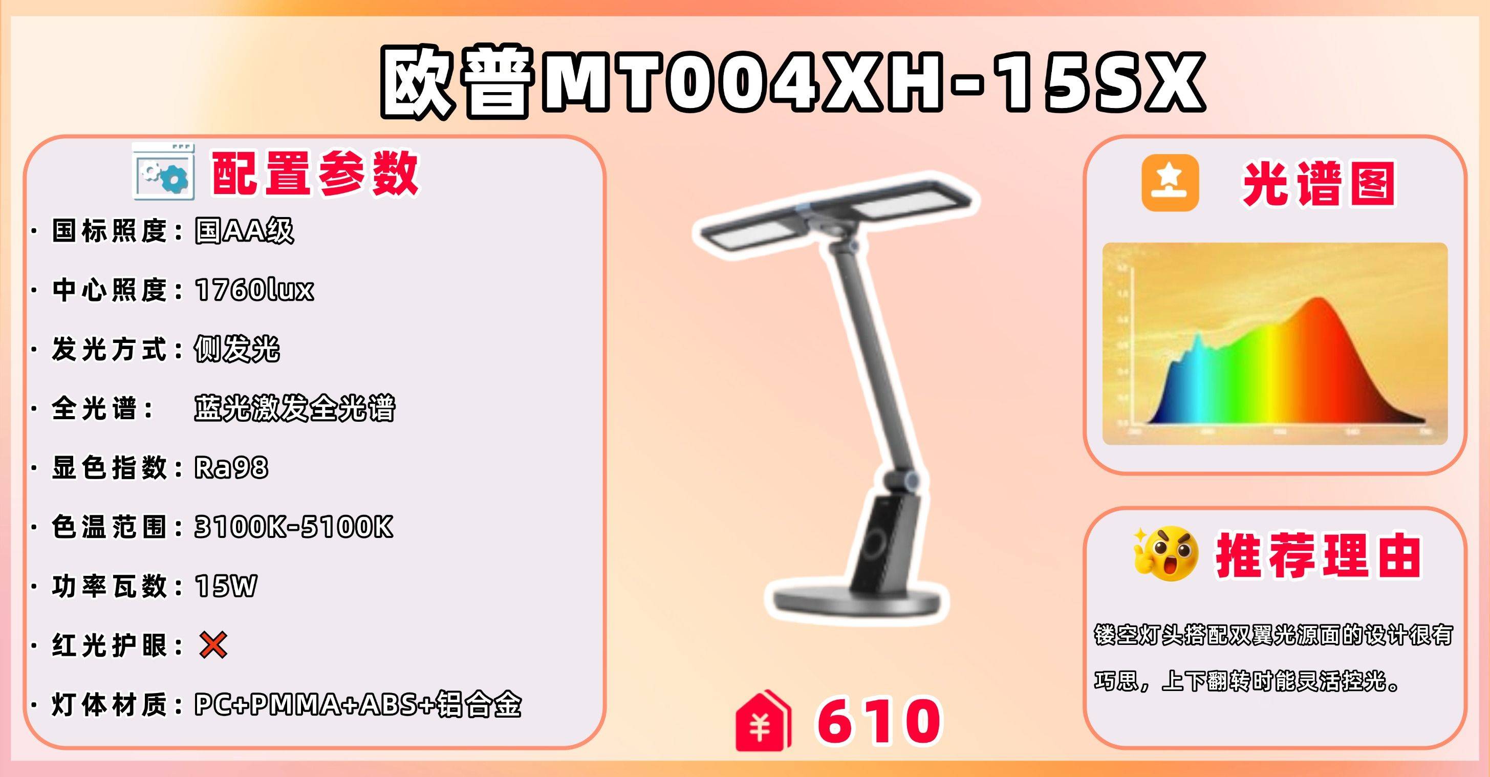 学生用的护眼台灯什么样的最好?欧普MT004XH-15SX台灯的造型颇具辨识度,中部配备可上下旋转的轴承,方便针对单面区域调节亮度。灯头直径约15厘米,在最大亮度的情况下能够将光线覆盖1.6m长的桌子,此外灯头支持上下角度调节,光线可灵活调整,使用体验还是比较便捷。