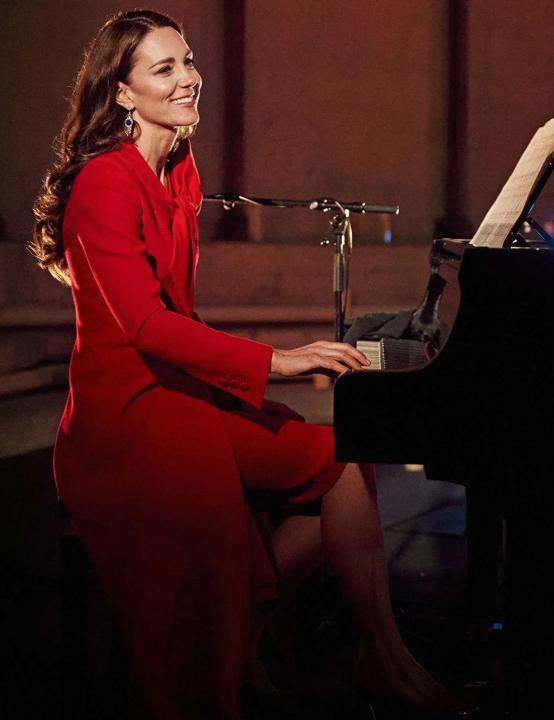 其实,凯特王妃首次为圣诞夜弹钢琴也引网友关注;她当时一袭红色风衣坐在钢琴前弹奏乐曲,笑容灿烂,发型也是披肩发发型,只不过一个人的微笑太假,还是和女儿互动的微笑更真实有爱。