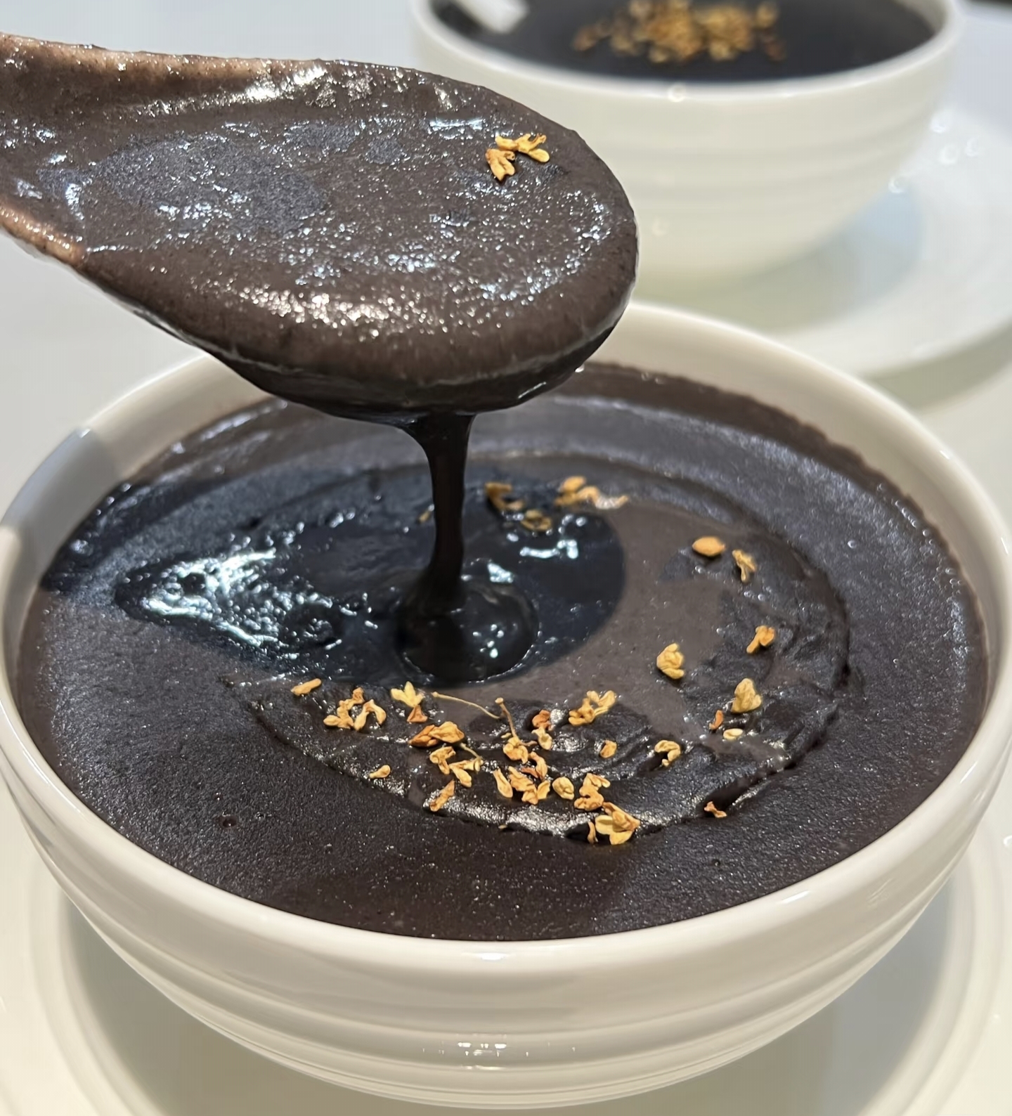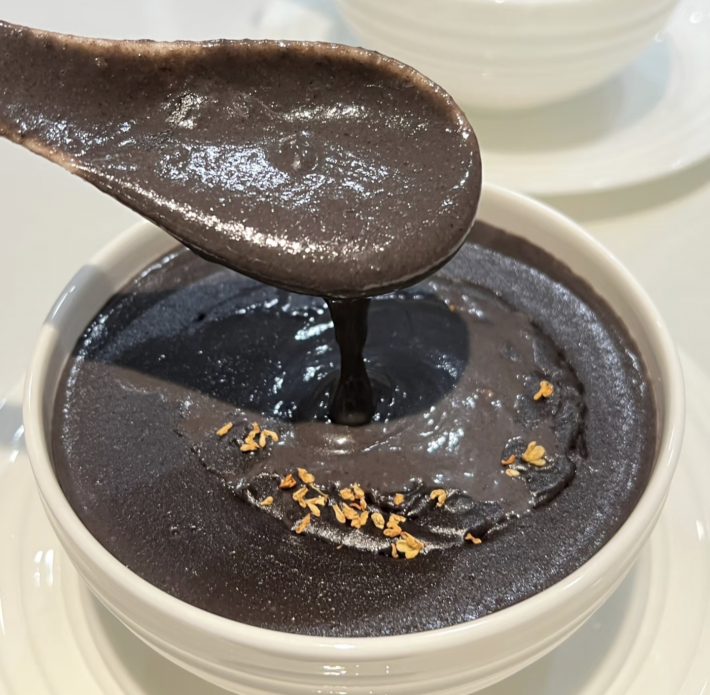 重点来了!想喝浓稠版加600ml水(约两杯半矿泉水瓶),稀薄版加800ml。新手建议从600ml开始尝试,打好后觉得厚再兑热水,比一次性加多更保险。选择"米糊"或"浓汤"模式坐等。这时候可以去洗漱/换衣服,听到"滴滴"声回来,满屋都是焦糖色的香气。打好的糊糊别急着喝!用滤网过筛两遍,瞬间变身婴儿辅食般的细腻质地。追求极致口感的,过滤完倒回锅里小火煮2分钟,表面会浮起层亮晶晶的芝麻油,这才是灵魂所在!