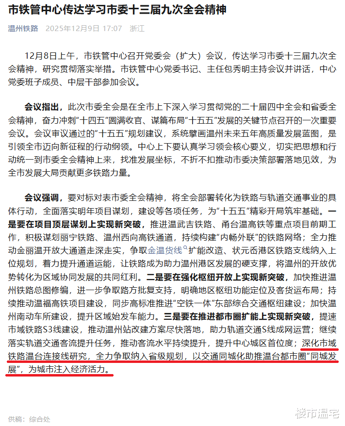 去年年底,在市铁管中心微信公众号“温州铁路”发布的相关内容,提到:深化市域铁路温台连接线研究,全力争取纳入省级规划。