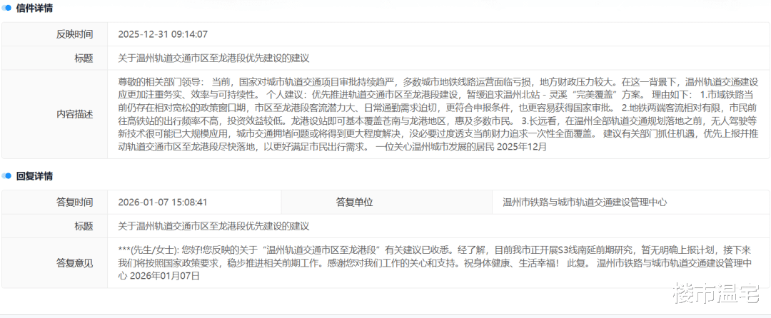 而在鳌江流域,当地居民又期盼S3线尽快建设南延段,正如这位市民在民呼我为平台上的建议。