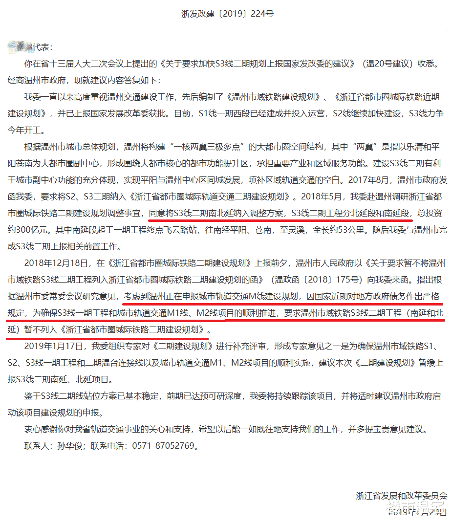 到了2018年年底上报前夕,温州方面考虑到温州正在申报城市轨道交通M线建设规划,为确保S3线一期工程和M1线、M2线项目的顺利推进,提出S3线二期工程(南延段和北延段)暂不列入《浙江省都市圈城际铁路二期建设规划》。