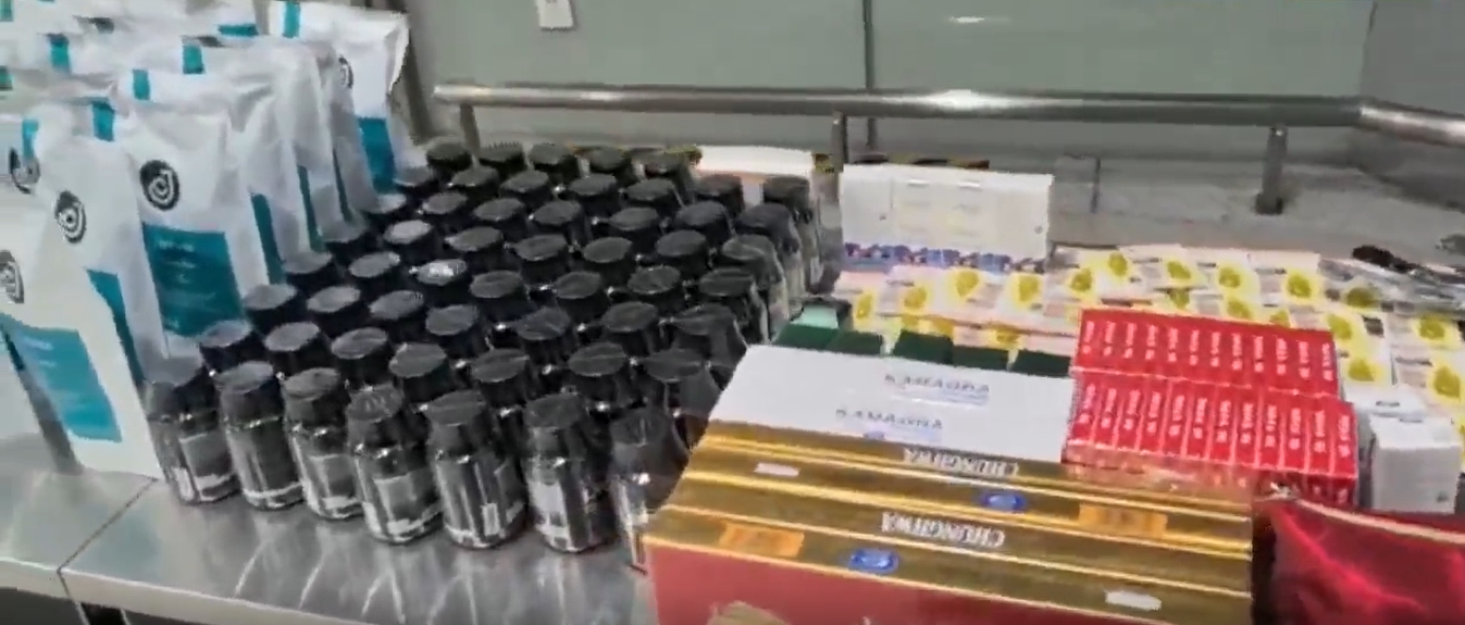 经开箱查验和现场清点,该名旅客携带未向海关申报的保健品78瓶、壮阳药26瓶、咖啡50袋、眼霜40支、香烟800支。
