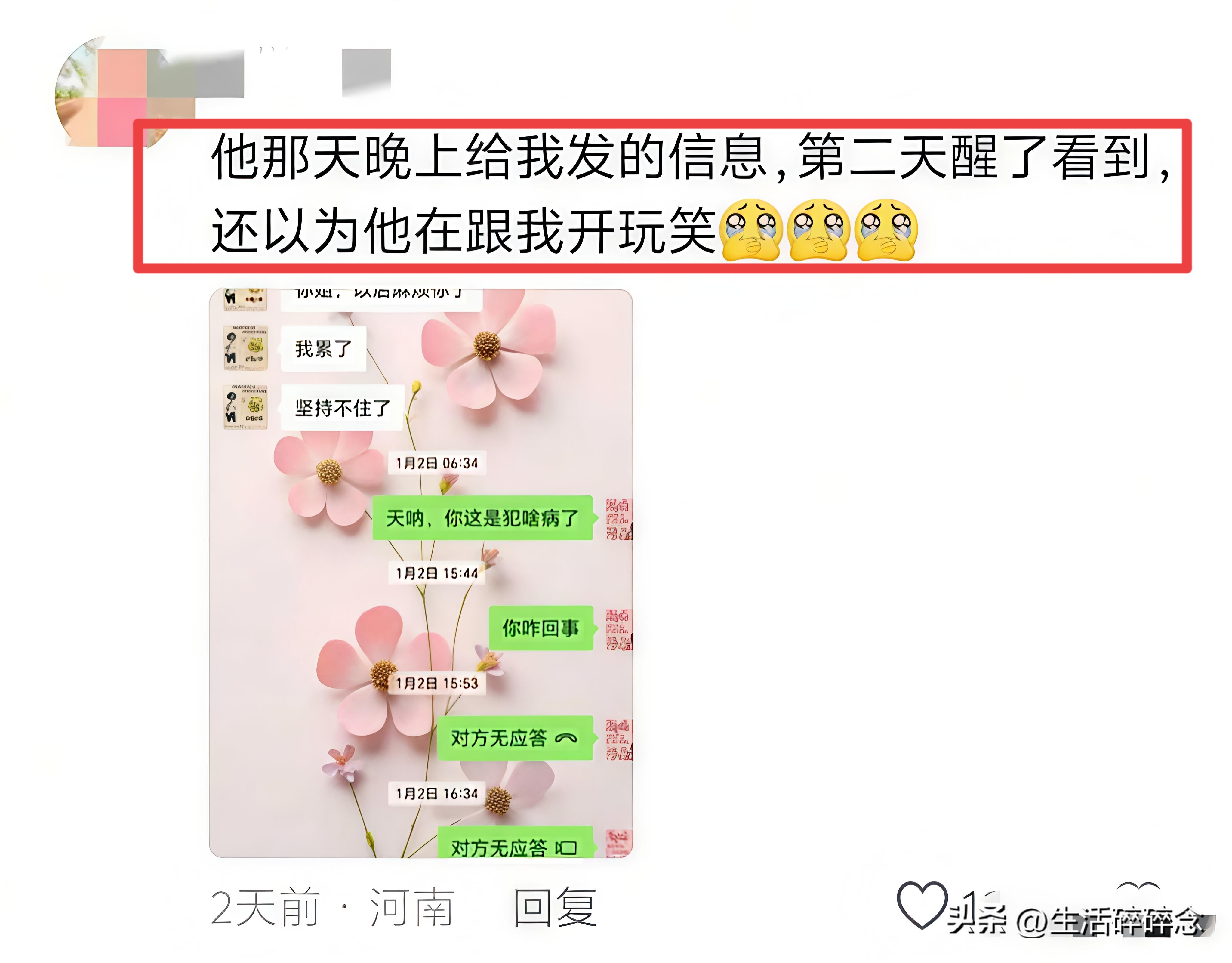 更让人揪心的是,事后家人才发现,男子还曾给小姨子发过消息,聊天记录显示,男子拜托小姨子照顾好妻子,并称自己太累了,坚持不住了。