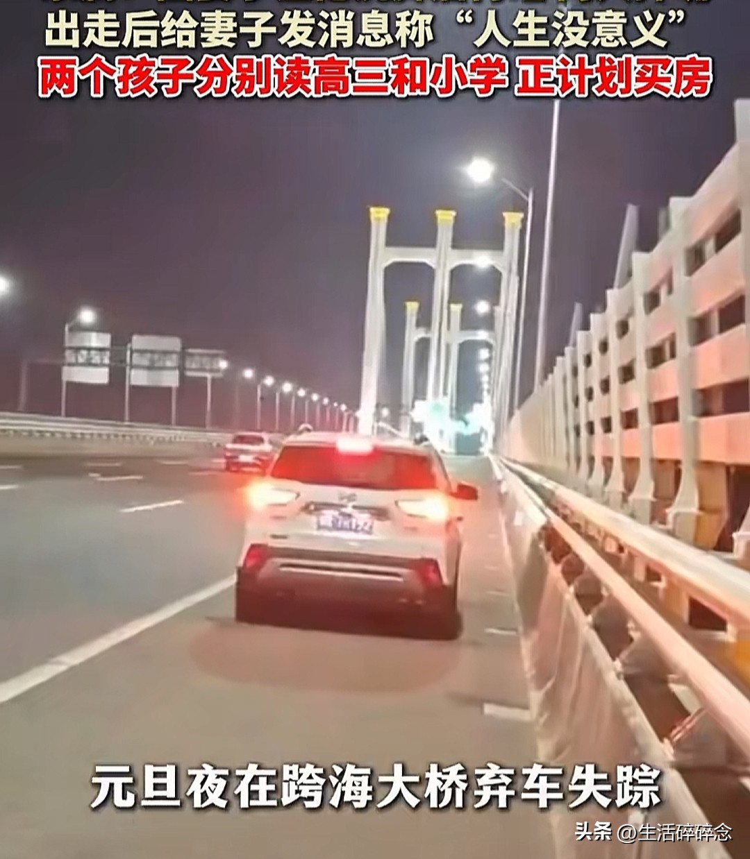 事发第二天家人报了警,警方在泉州湾跨海大桥的应急车道上找到了男子的白色轿车。车子打着双闪,车门完好,手机、钱包、证件等物品都留在车内,唯独不见人影。