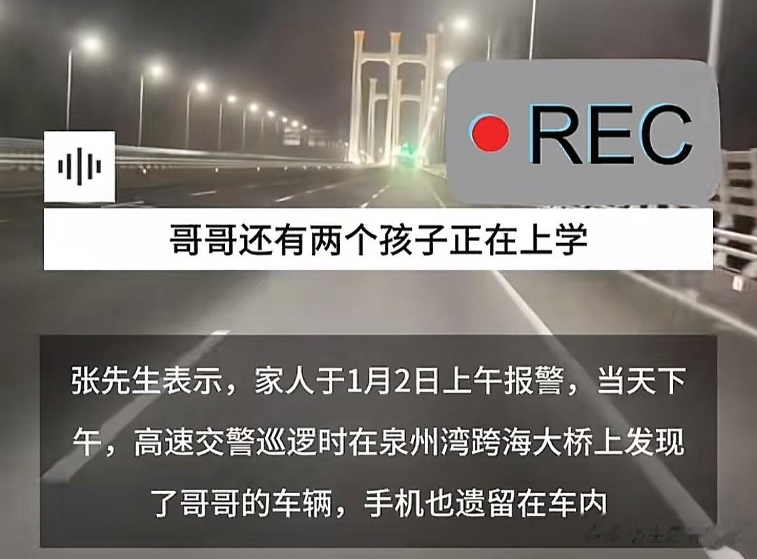 1月1日,38岁的河南籍男子张某在福建泉州湾跨海大桥上离奇失踪,如今已经过去了十多天,搜救工作还在继续,可男子去向依旧没有任何线索。