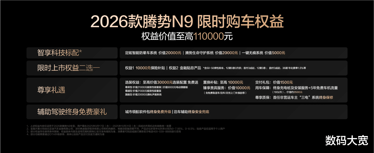 为回馈广大用户的支持与信赖,2026款腾势N9特别推出限时购车权益:10月31日(含)前提车的用户,全系可享10000元保险补贴或金融贴息(二选一),置换补贴至高10000元。此外,还有价值45000元的智享科技,以及辅助驾驶终身免费豪礼。根据不同款型,限时赠送极致性能套装、电动侧踏板、隐私声盾等科技豪华配置。智能电动门、吸顶屏套装、流媒体外后视镜以及双色车身均享限时选装价格,让豪华触手可及。详情敬请咨询腾势直营店及当地经销商。