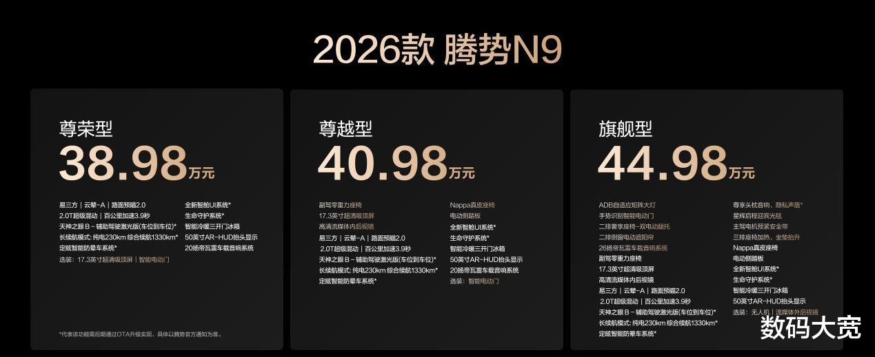 9月17日,2026款腾势N9正式上市,共推出尊荣型、尊越型、旗舰型3款车型,官方指导价38.98万元~44.98万元!