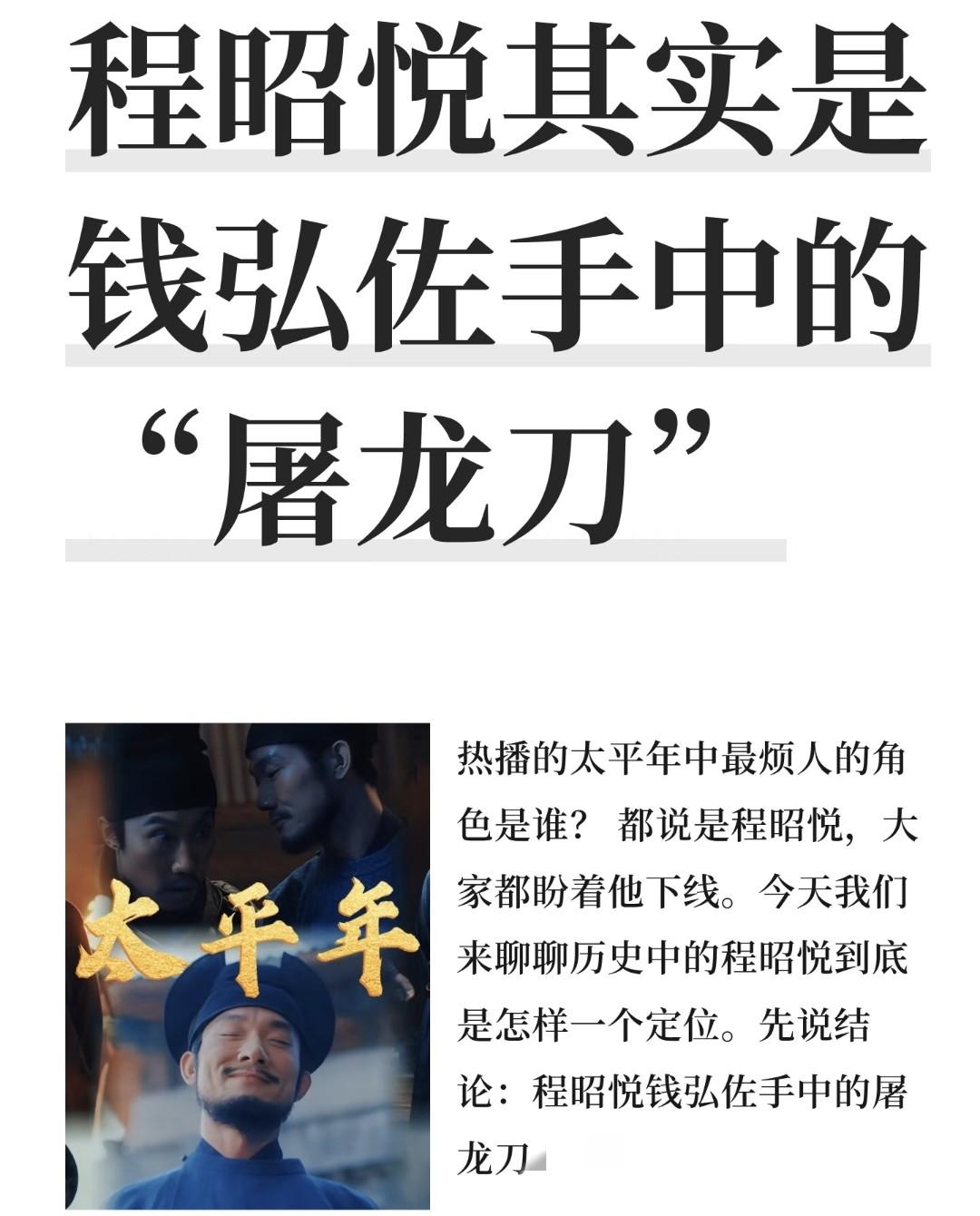当天福十二年(947年),程昭悦的谋反迹象日益明显,钱弘佐不再隐忍,以雷霆手段下令将其逮捕。庭审之上,罪证确凿,程昭悦被当众斩首,党羽尽数被灭,其短暂而疯狂的专权之路戛然而止。史书记载,行刑之日,钱塘百姓围观者众,昔日权倾朝野的重臣最终落得身首异处的下场,令人唏嘘。当然,在《太平年》剧中,他最后是自焚而亡,并且高歌一曲黄巢的诗,真要感谢编剧把这个人物的个性扩展到了极致,使本剧观赏性大大提升,若按正史写则魅力尽失。