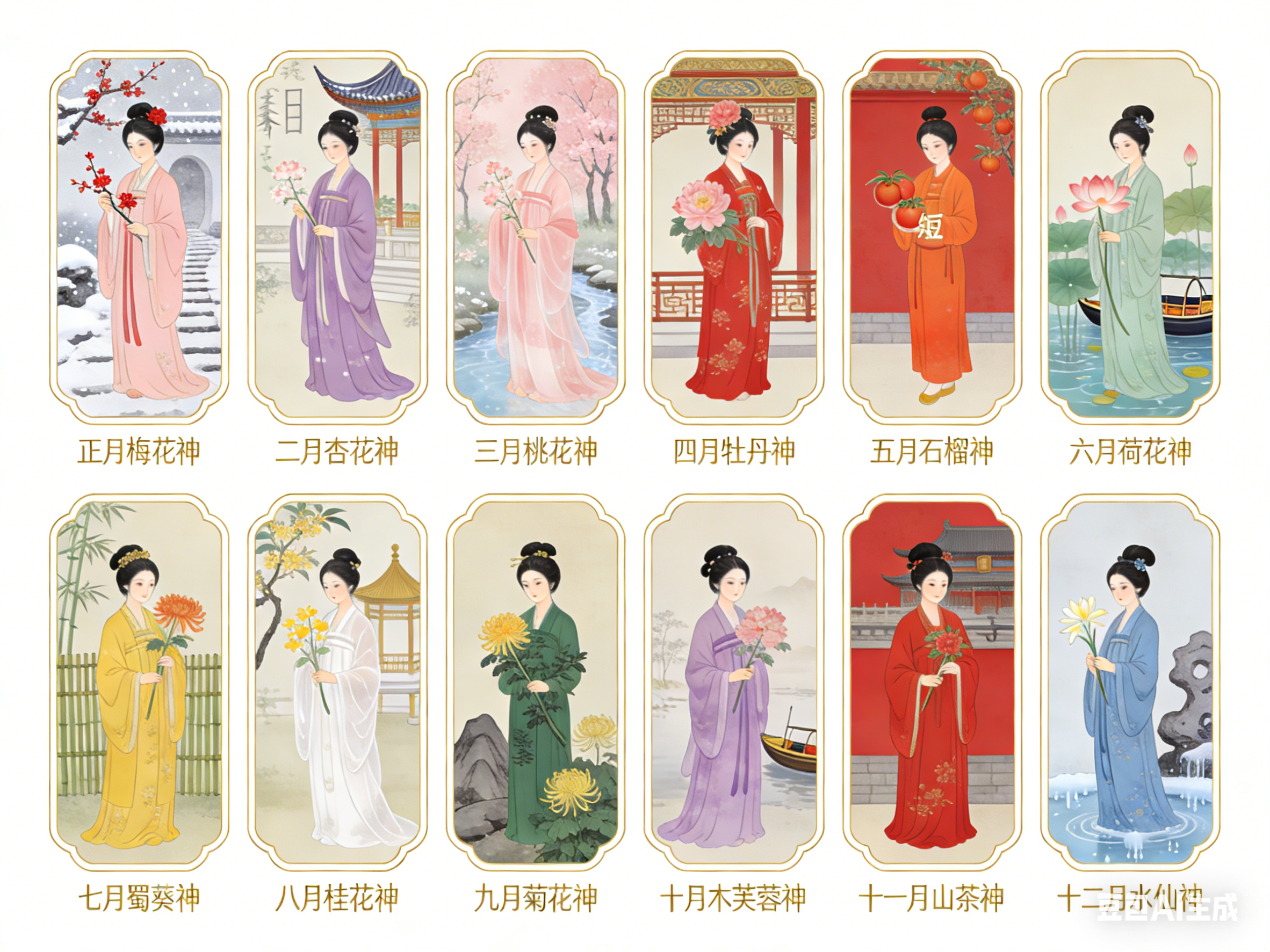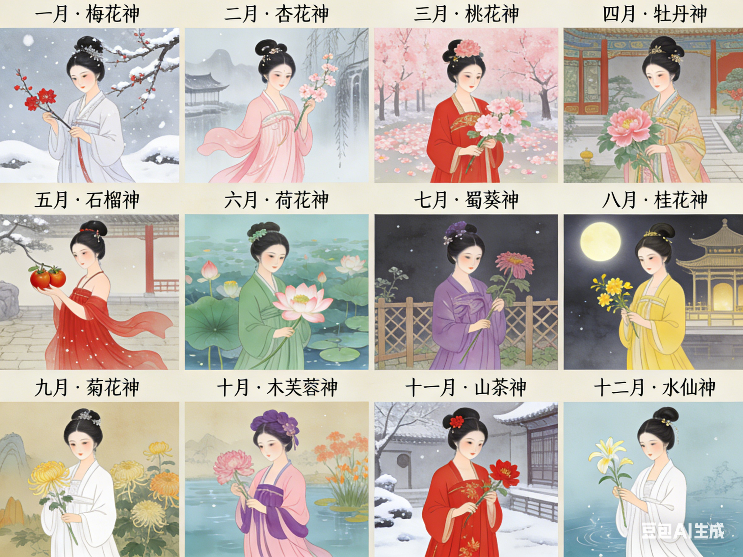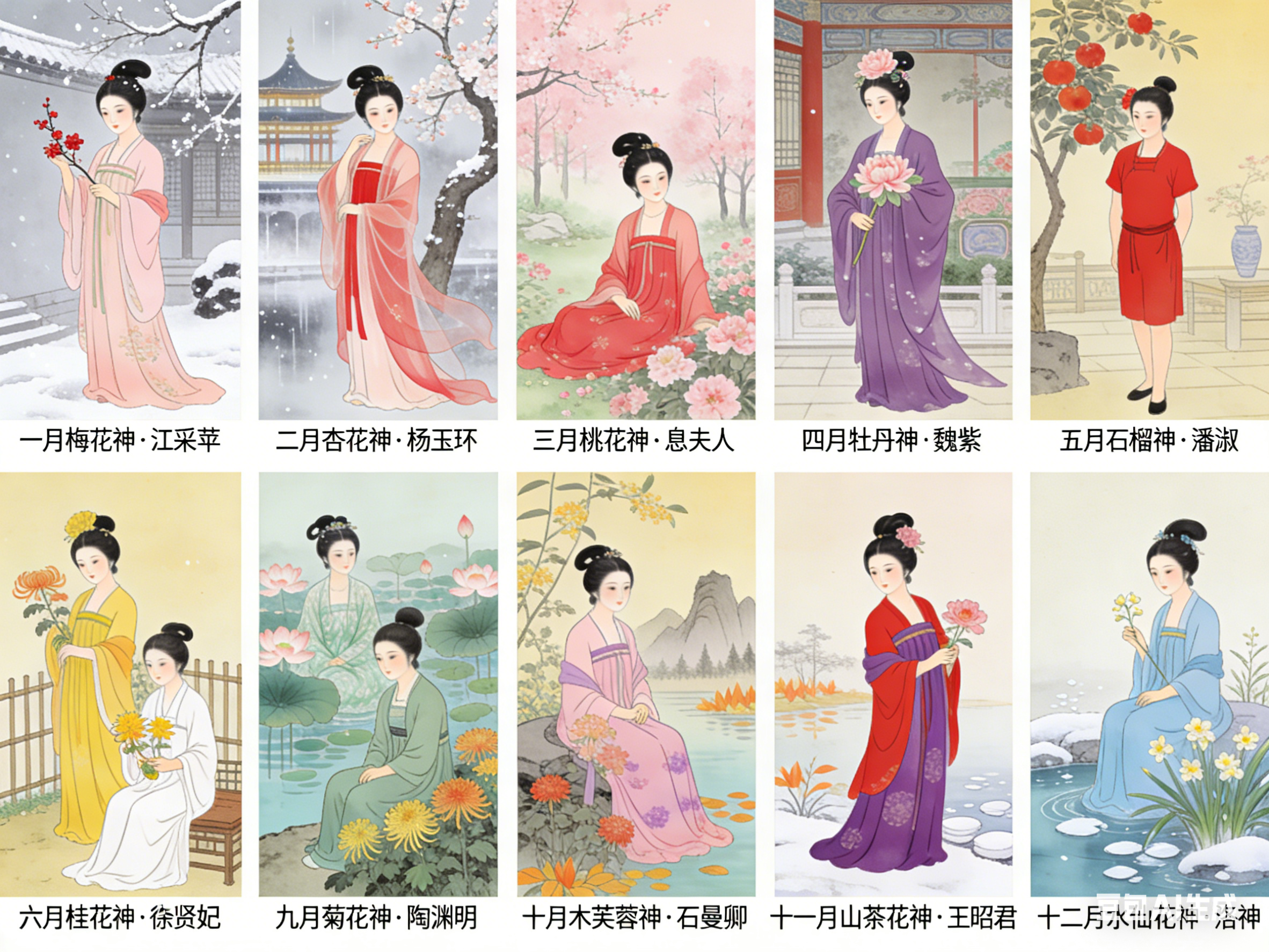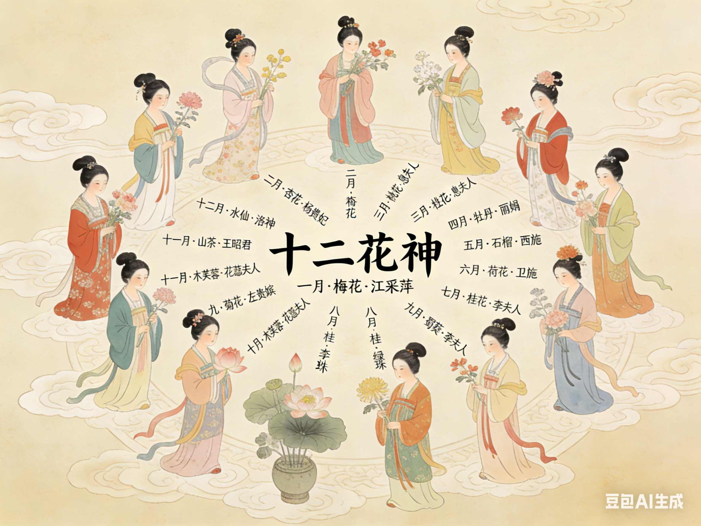 十二花神是中国民俗文化的独特构成。以农历十二月为序,一月一花,一花一神。体系将自然物候、人文典故与民族品格相融,形成月令美学传统。其并非单一典籍固化的概念,而是在数千年历史中,由神话信仰、节令习俗与文人审美共同浇灌而成的文化硕果。