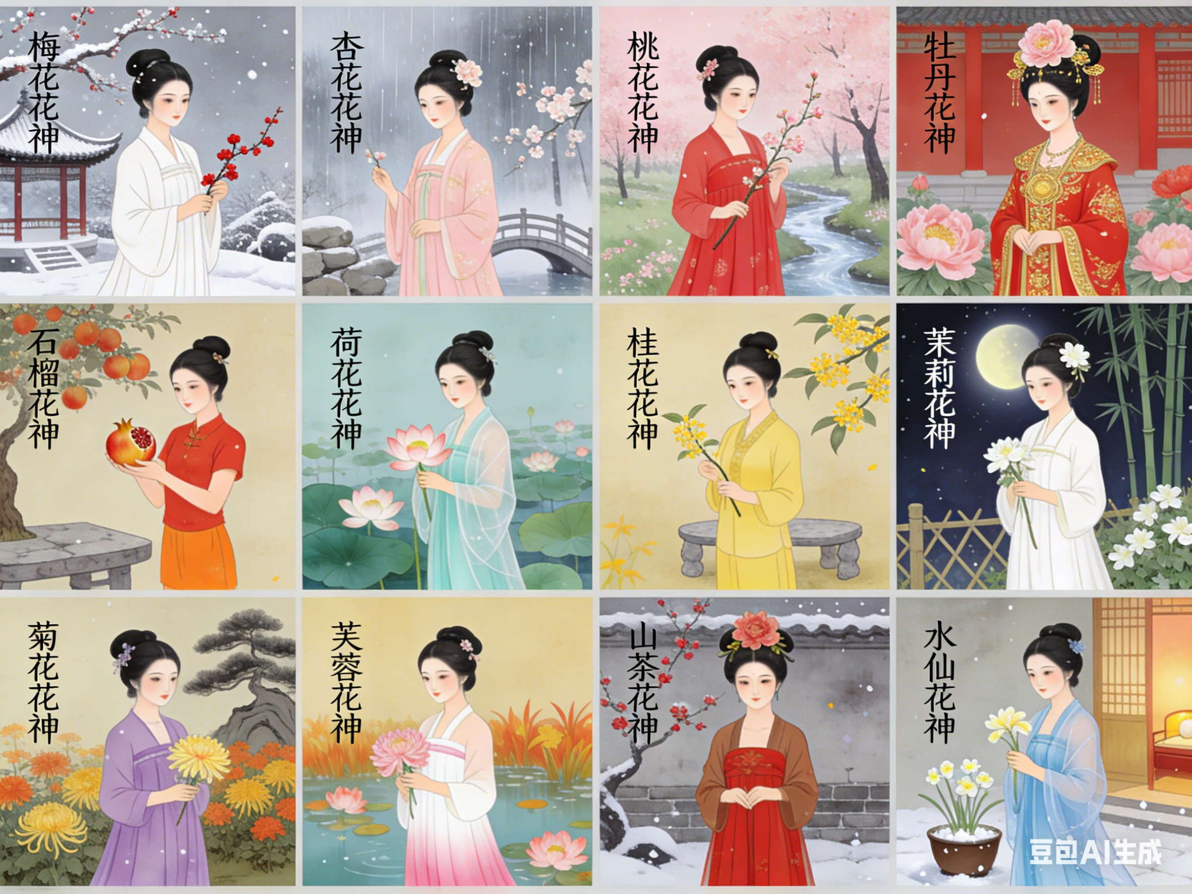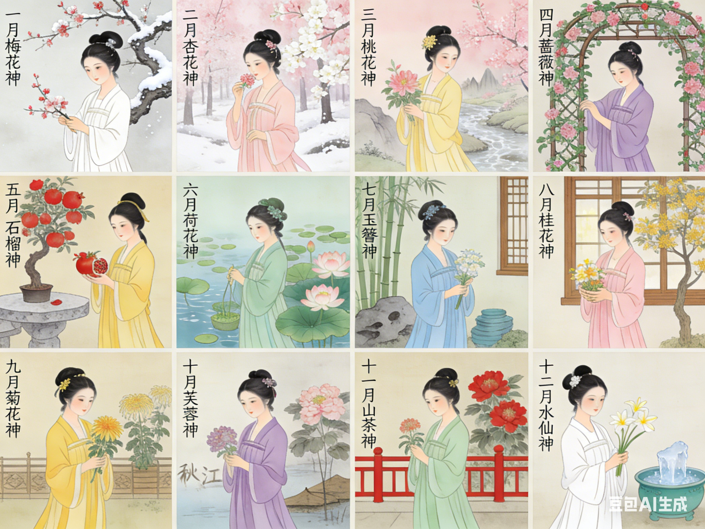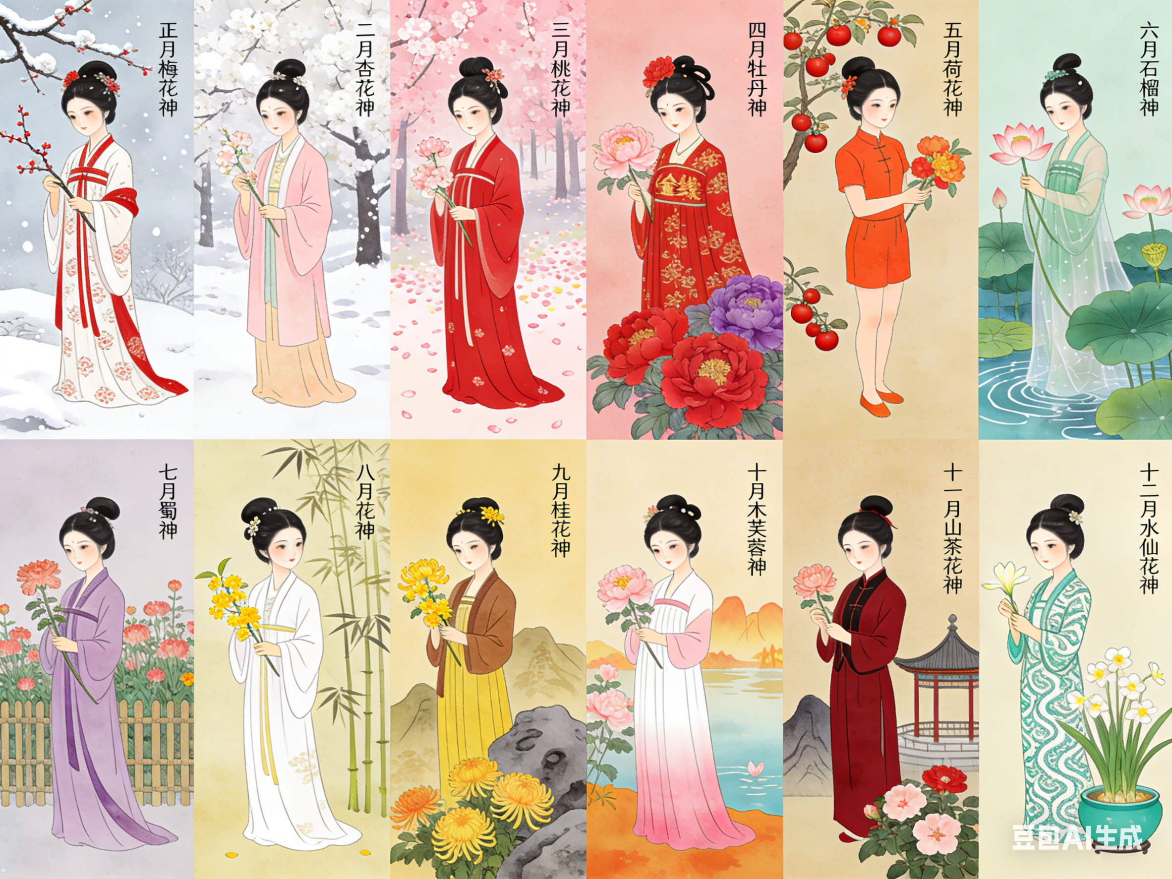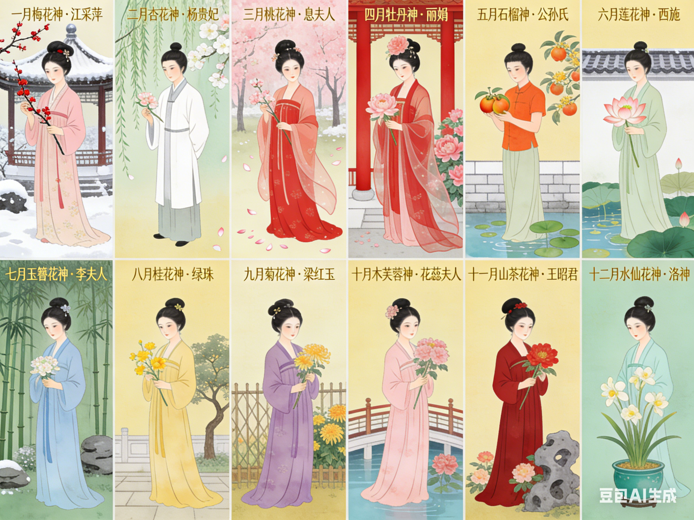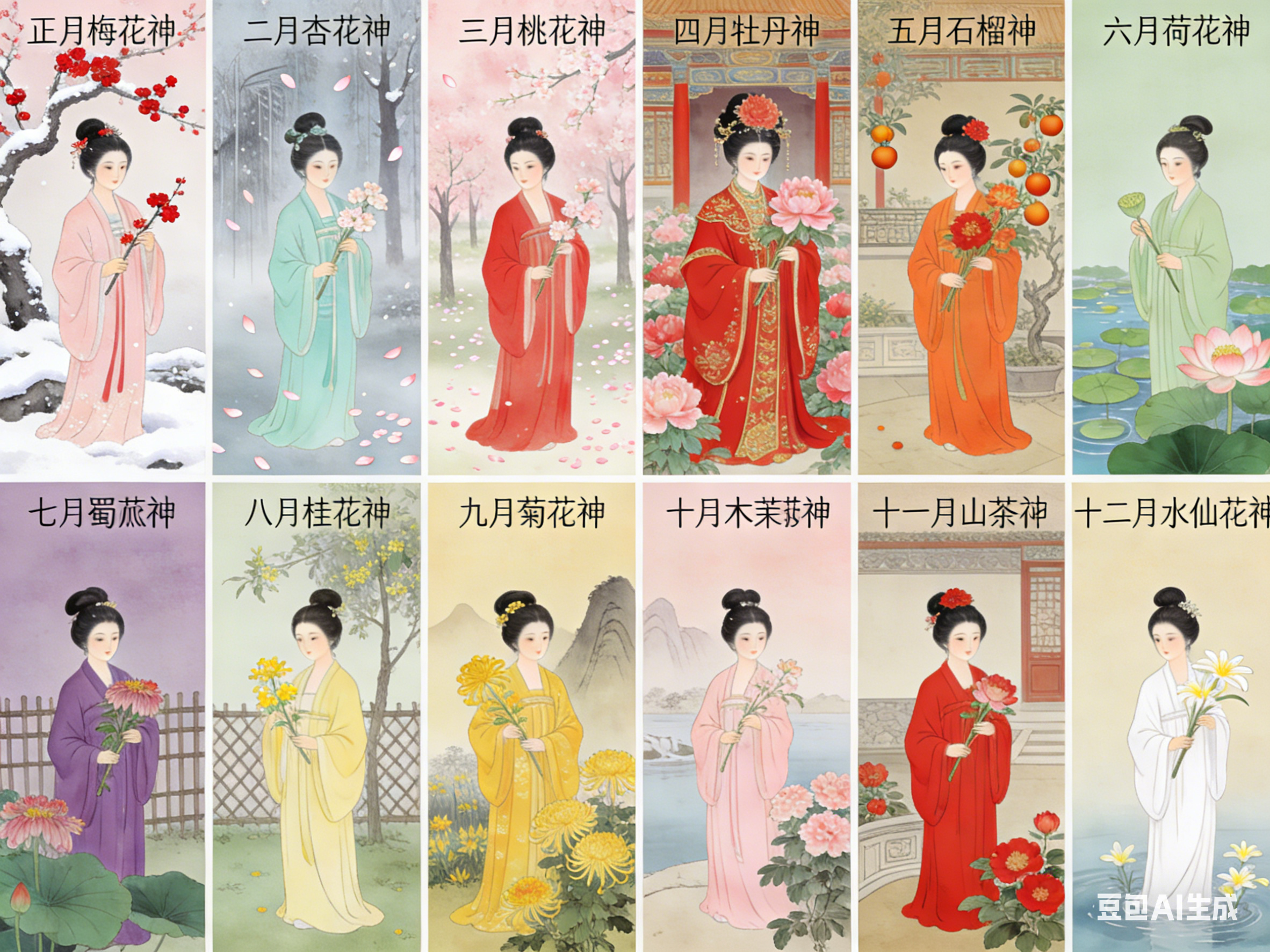 十二花神是中国民俗文化的独特构成。以农历十二月为序,一月一花,一花一神。体系将自然物候、人文典故与民族品格相融,形成月令美学传统。其并非单一典籍固化的概念,而是在数千年历史中,由神话信仰、节令习俗与文人审美共同浇灌而成的文化硕果。
